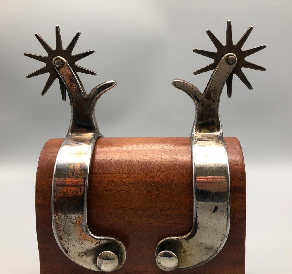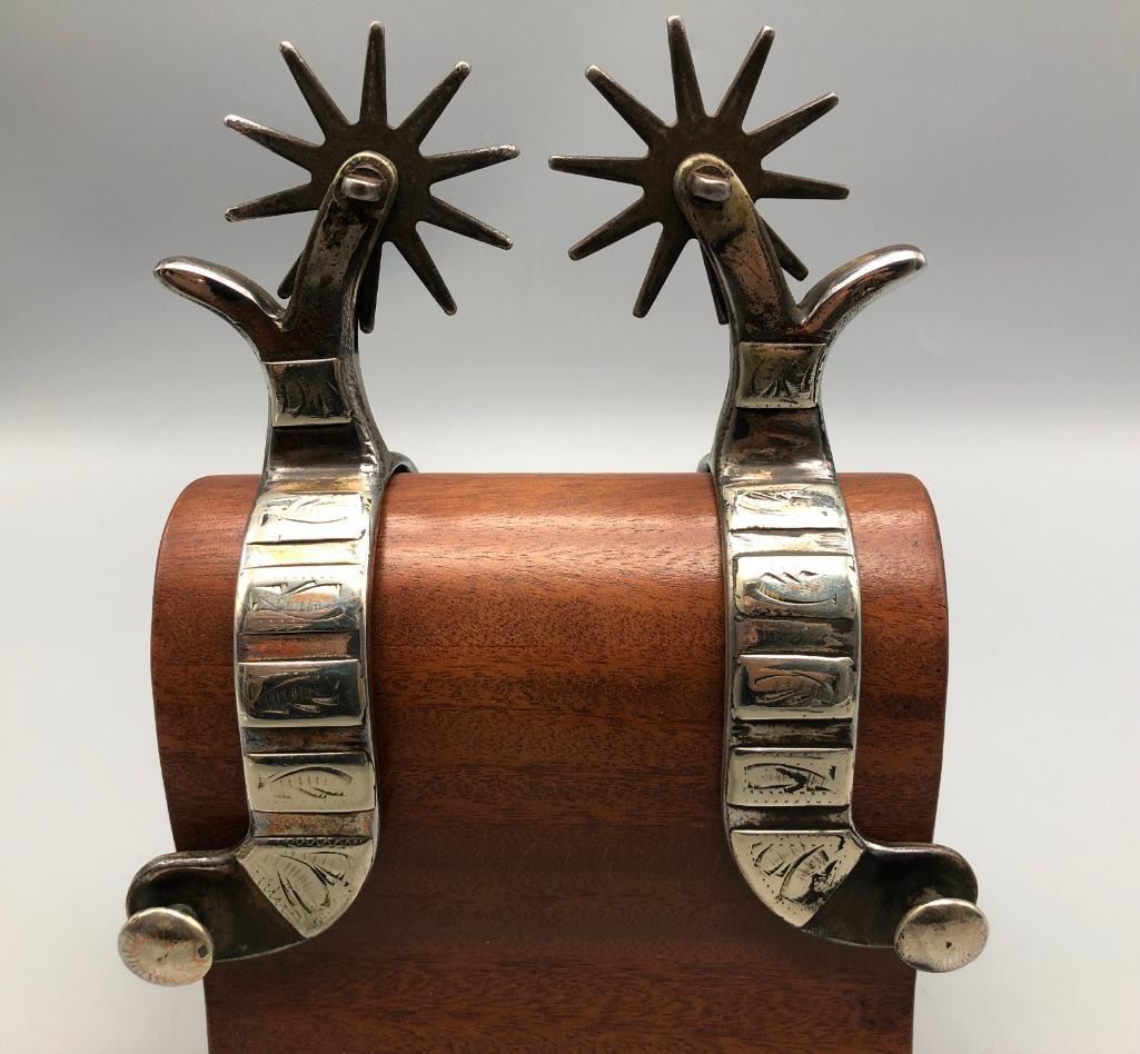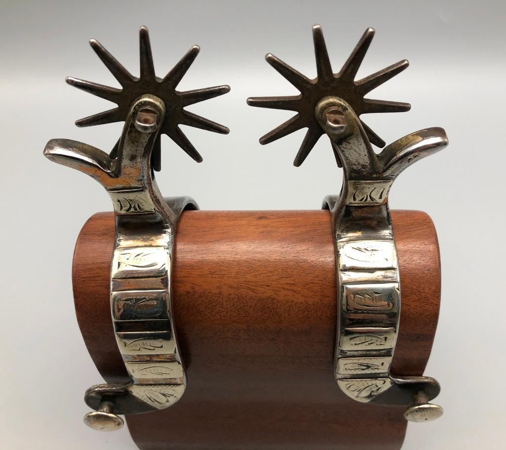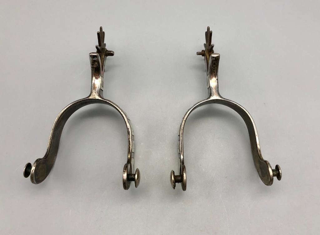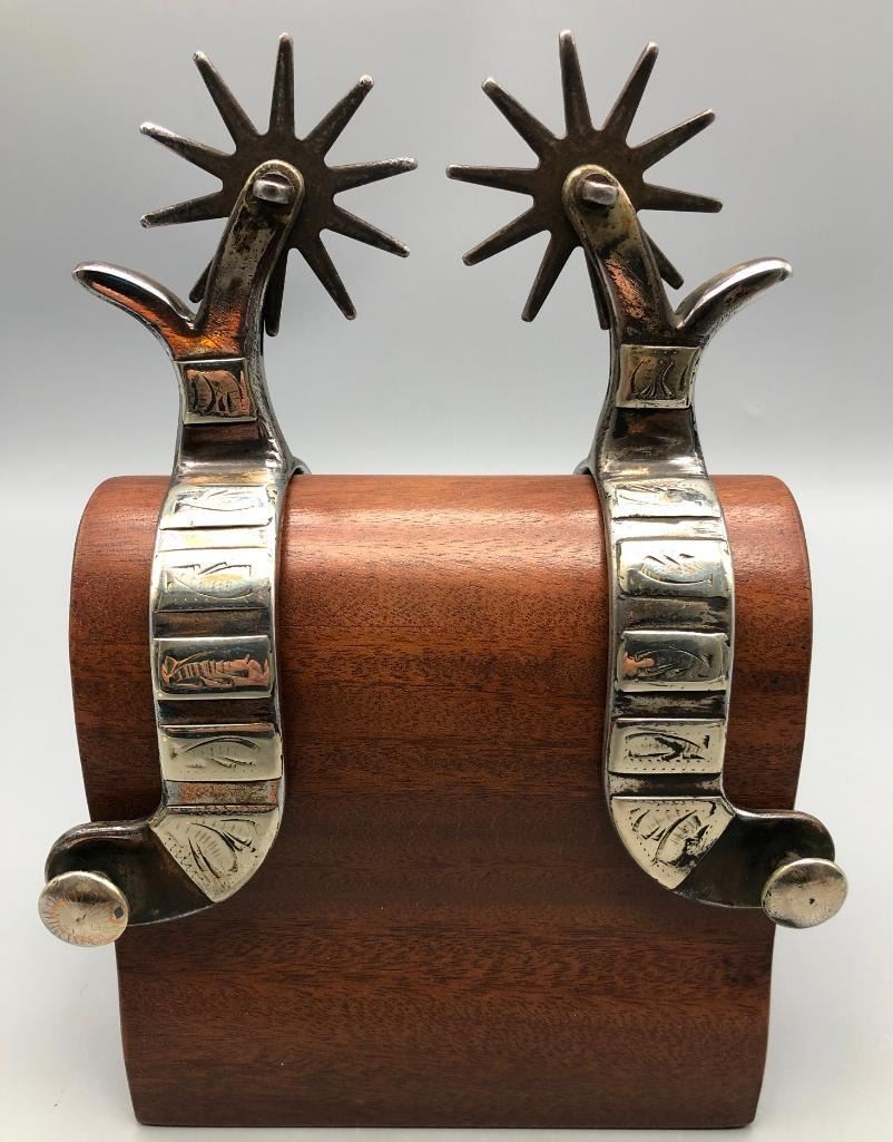 Offered for sale in this lot is a pair of unmarked Mexican spurs. They are single mounted with a Crockett or Kelly Bros. type of design. They have been highly polished to the point they almost appear to be nickel plated. MAKER: Unmarked, but Mexican in origin. APPROX AGE: Vintage. SIZE: Heel measures 3-1/8 inches, band measures 1 inch and shank measures 3-1/4 inches. CONDITION: Good for its age, some wear expected and they have been altered (see description above). Please look closely at the pictures as they are an important part of our description and are hereby incorporated into the description, specifically with regards to condition. SHIPPING: There will be a $8 handling / packaging fee for shipping this lot. The actual cost of postage will be added on top of that. BUY IT NOW: If you would like to buy this item now, without waiting for the auction day to bid on it, we do offer this option (which is available up to 48 hours before the actual auction starts). The “Buy it Now†price is the high estimate of this lot (plus applicable fees and the Buyer's premium is discounted to 10% when using the Buy it Now option). If you would like to exercise this option, you must contact us by email (or phone as long as you talk to someone live). Reference this lot number and your intention to "Buy it Now."