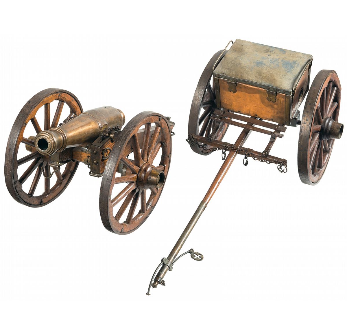 Measuring approximately 42 inches fully assembled, the lot consists of a 10 1/2 inch long brass cannon with no visible makers markings, an iron-reinforced hardwood carriage and a hardwood caisson/wagon of similar construction fitted with a wood, brass and tin ammunition case. Both the carriage and caisson are 11 3/4 inches wide with 9 inch diameter wheels.