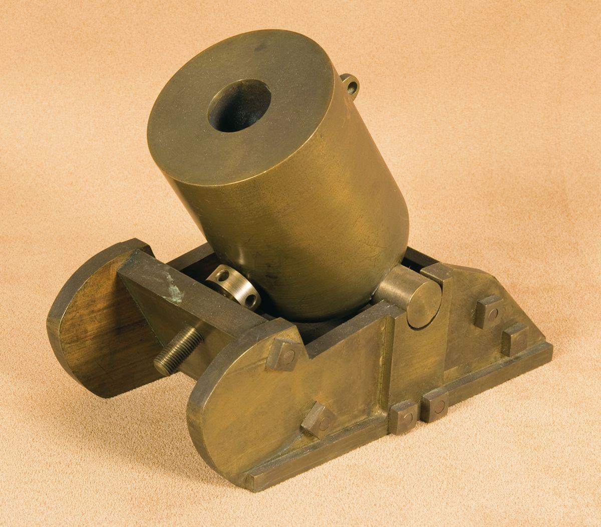 Mortar is 4" long and nearly 3 1/2" wide at the muzzle, with a 1" diameter bore and a cleanly drilled touchhole. The base is a solid brass sled, measuring 5" wide, 9" long and 2 3/4" high, with an elevation adjustment screw. No markings present. Functional touchhole. Excellent overall with mostly a dark aged patina.