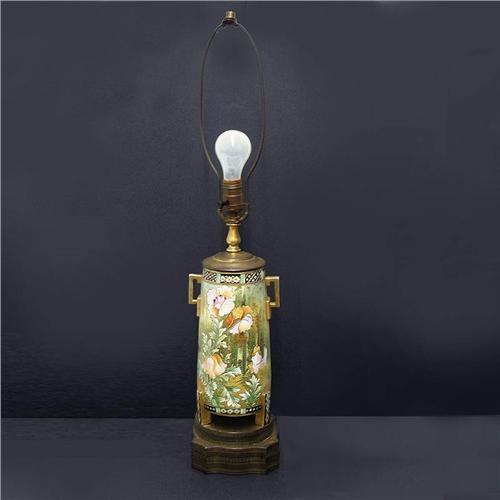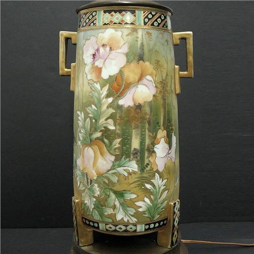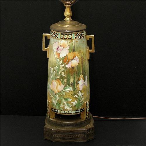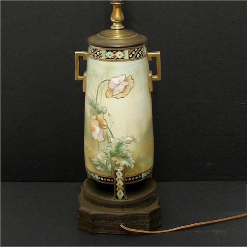 Unmarked Nippon hand painted handled lamp; banded decoration around top and base; hand painted poppy decoration; four feet; on round brass base; early to mid 20th C.; 17" high; no visible defects