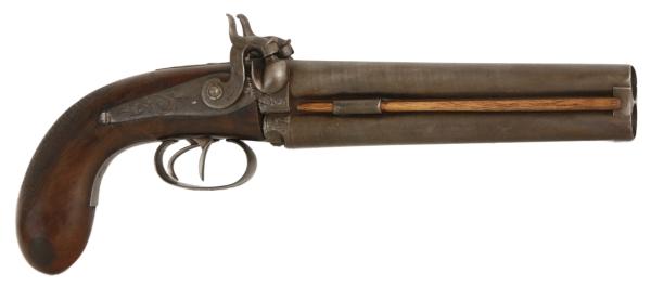 Unmarked Over-under Percussion Pistol. 7 ½ " Damascus barrels are 68 caliber and have pitted bores. The locks, breech end of barrels, hammers and triggerguard are nicely engraved. The barrels are a gray-light brown mix and the Damascus pattern is still visible but light. Most other metal surfaces are blue thinning to gray. The wood stock is bag-shaped with checkering along the back and some nice figure towards the front-it's in fine condition. Given the large caliber and configuration, this might be a Howdah pistol.