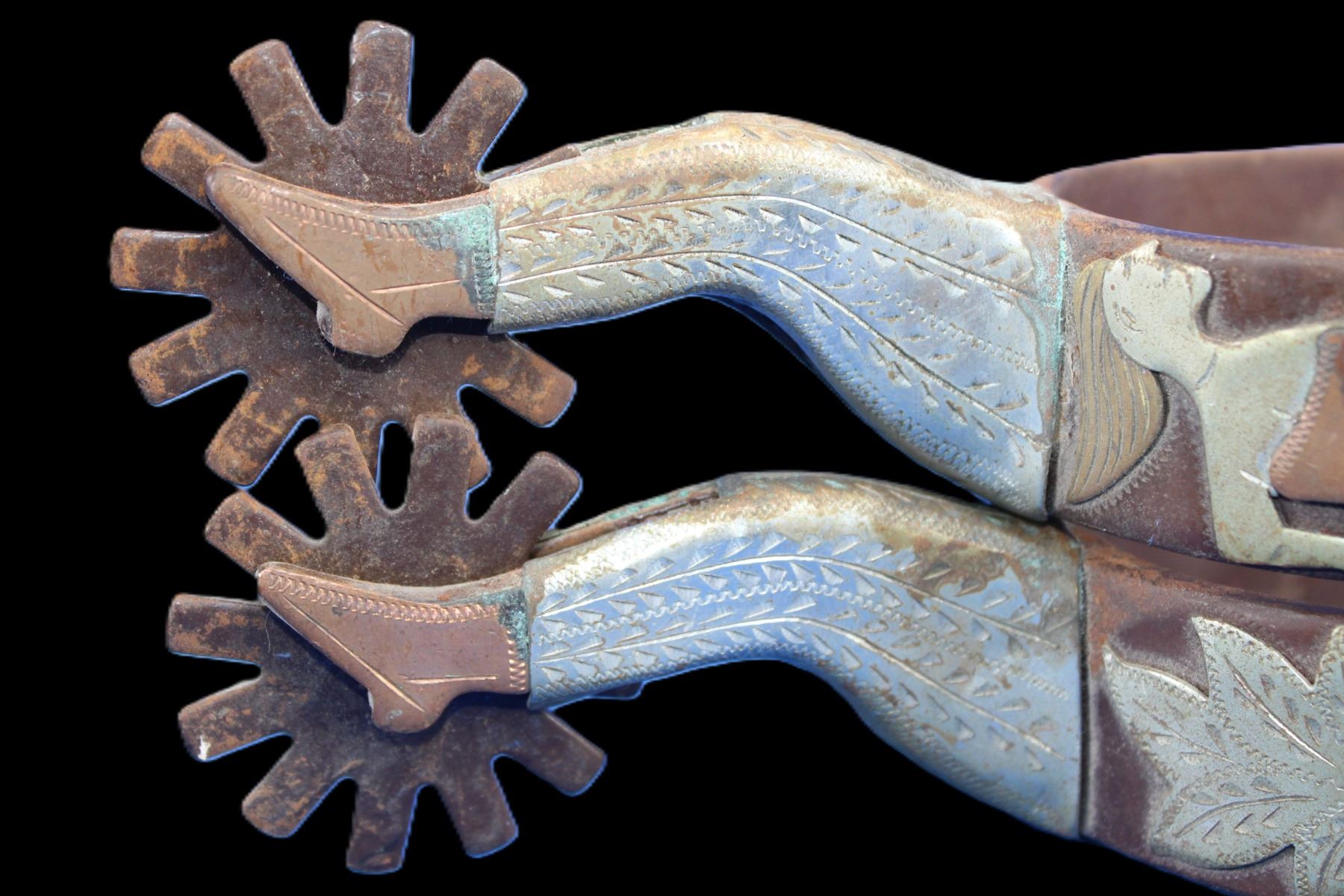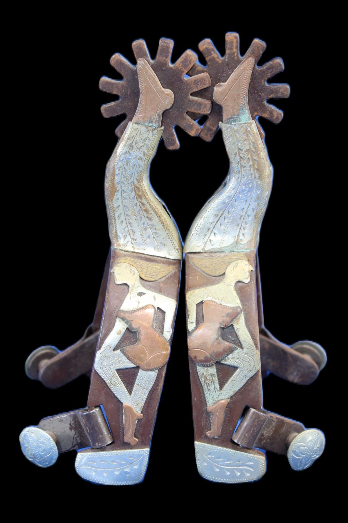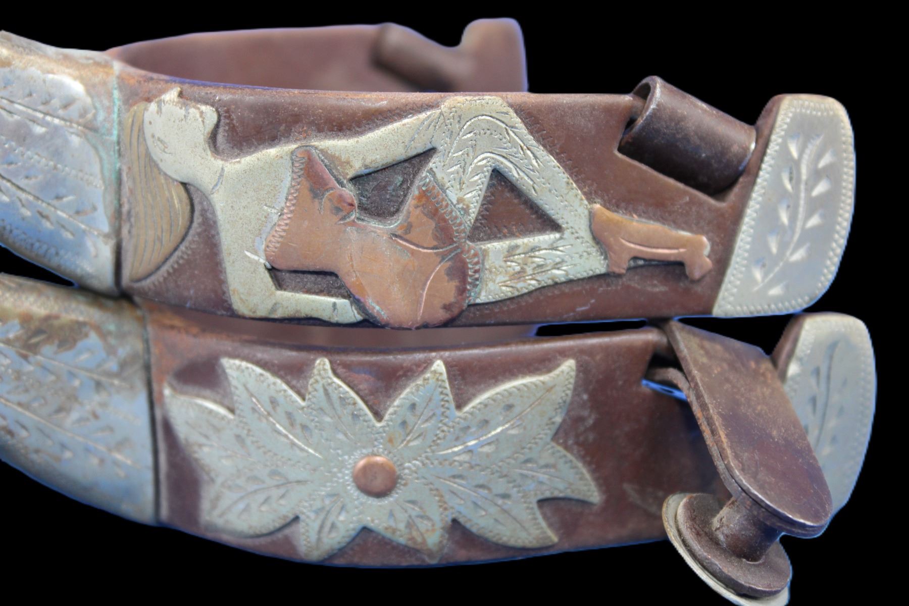 Unmarked Overlaid And Copper Double Mounted Lady Leg Spurs- 1.2" Bands- 2.75" Shanks- 1.75" 12 Point Rowels- Swinging Buttons- Need A Good Cleaning