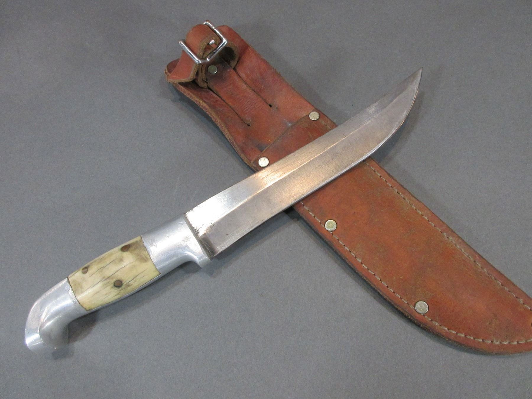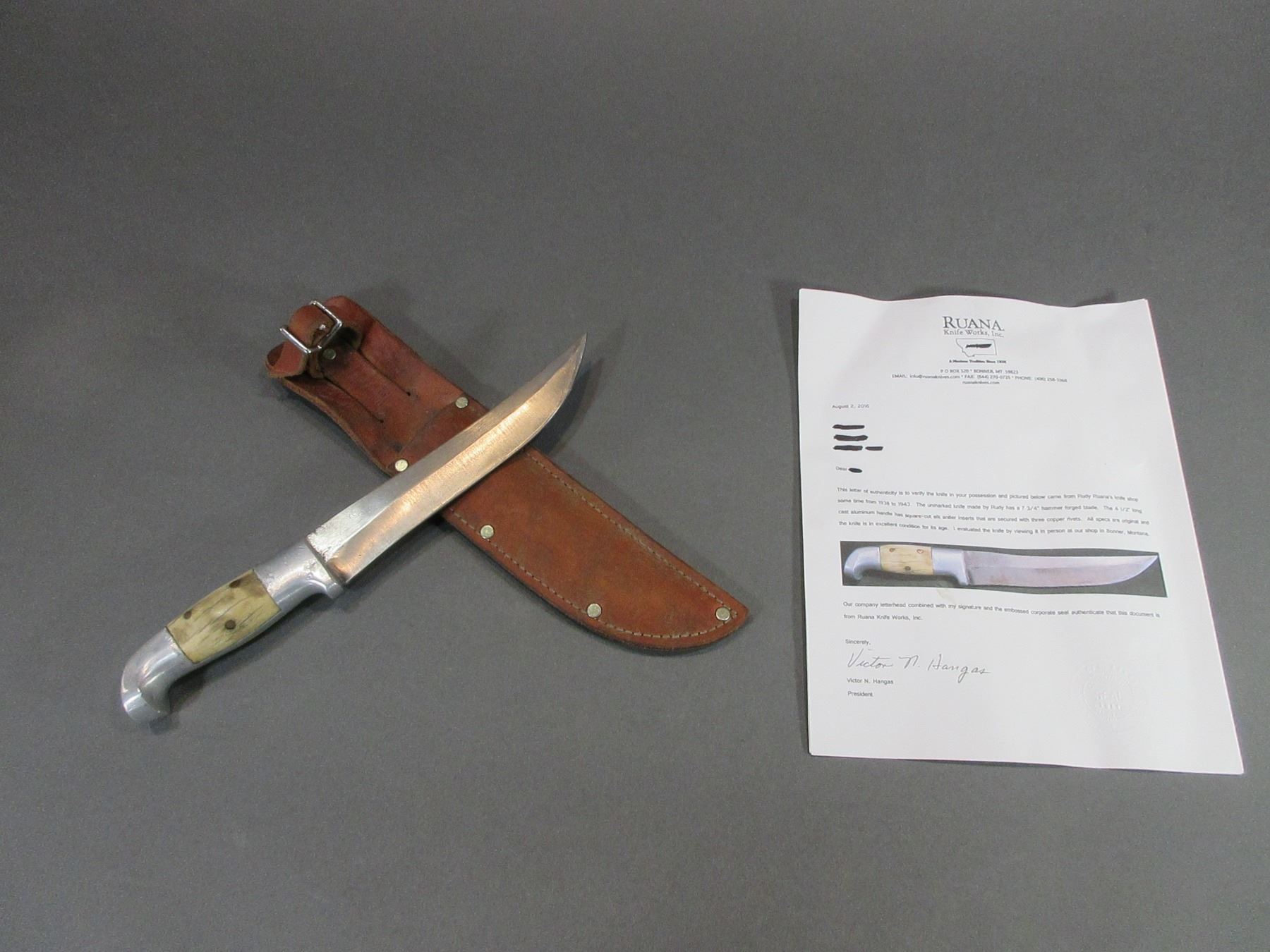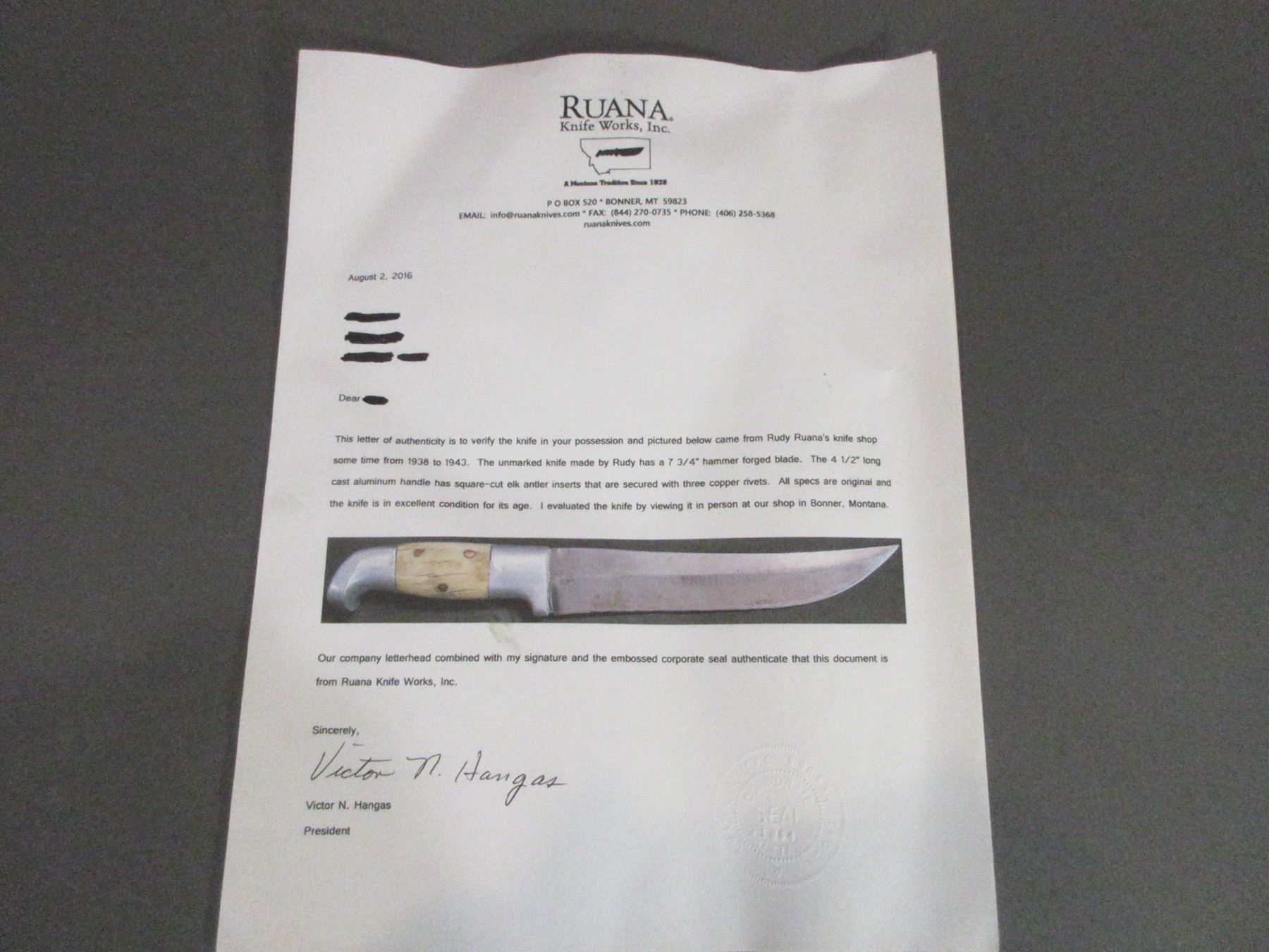 Unmarked Ruana Knife With Letter Of Authenticity- Rudy Built This Knife Between 1938 And 1943- Sheath- Blade 7.75" Square Cut Handle 4.5"- 3 Rivets- Hard To Find