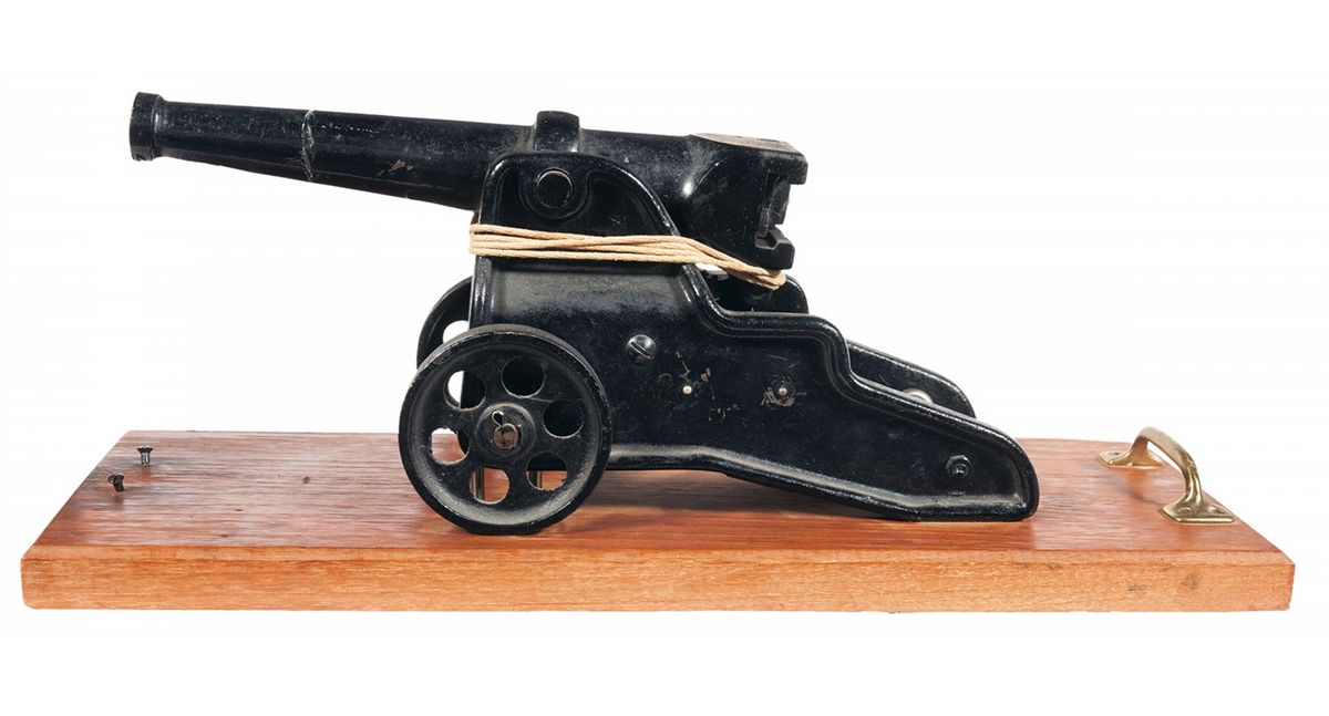 Believed to have been manufactured by the Naval Company of Doylestown, PA. this cannon uses a Hotchkiss style sliding breech for loading, spring loaded firing pin, and a lanyard-operated hammer. The carriage is unmarked, but otherwise nearly identical to the standard production model produced by the Naval Company. Mounted on a wooden display base. Formally from the collection of noted firearms expert and author Frank Sellers, who stated that he had received the cannon from the Winchester factory collection, in exchange for evaluation services.