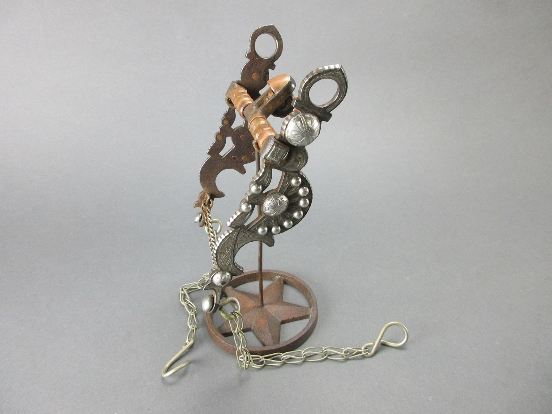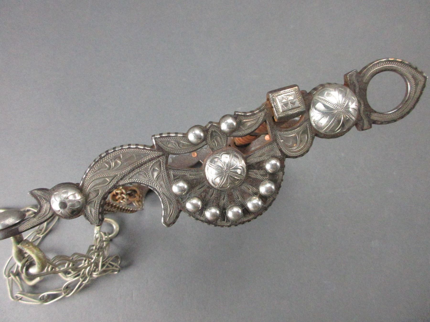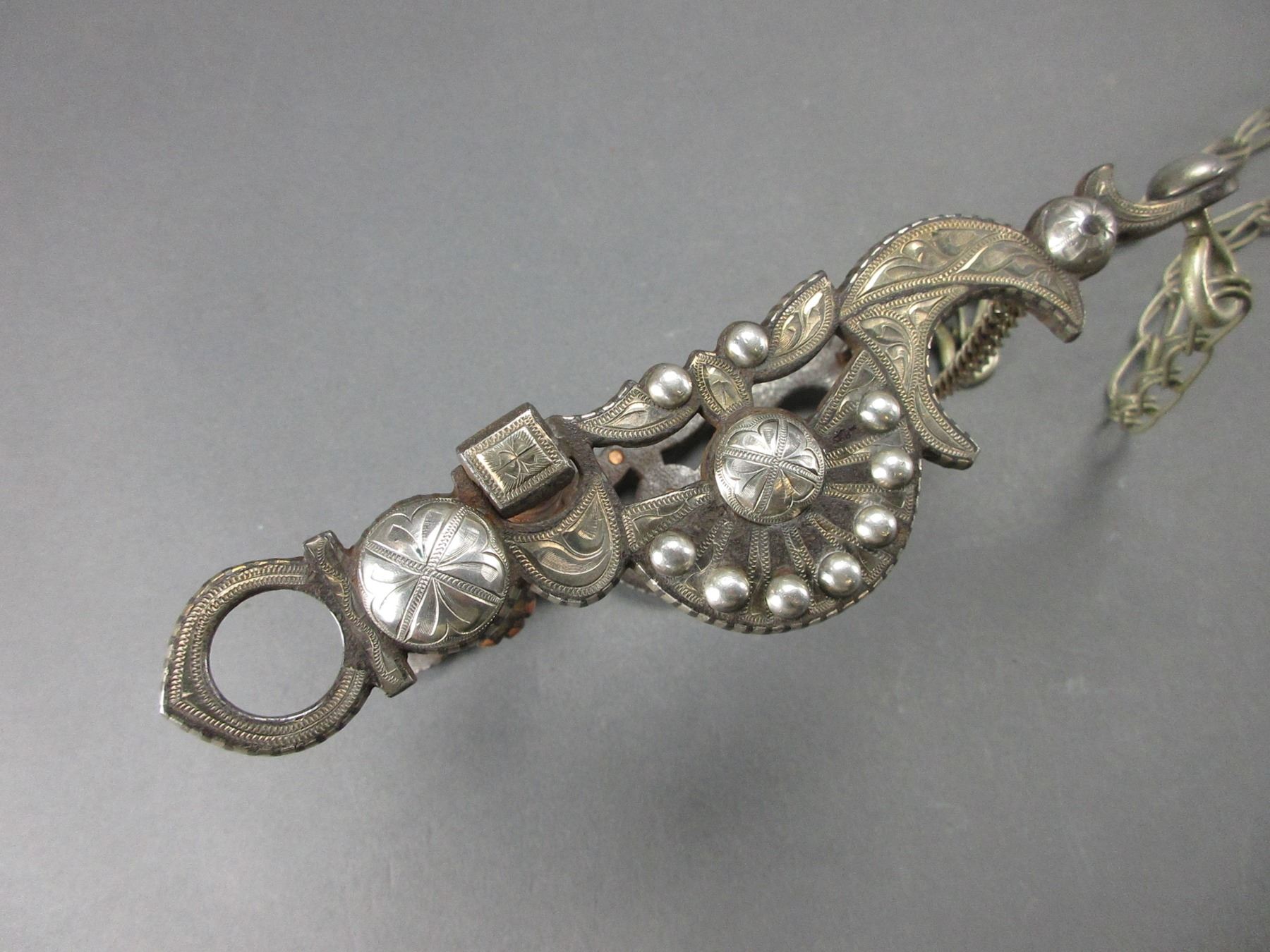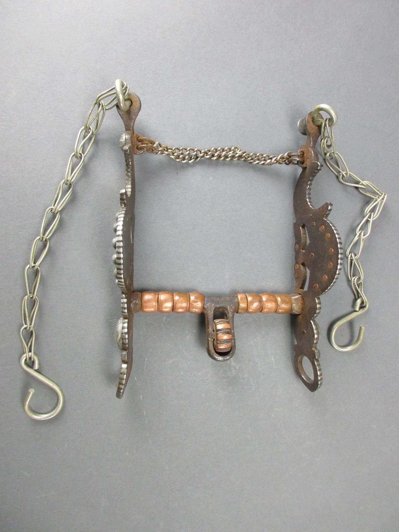 Unmarked Silver Inlaid Bit- Carmel Style Cheek- Covered Halfbreed Mouth- Double Slobber Chains- Rein Chains- Very Good Condition- Copper Rings On Cannon
