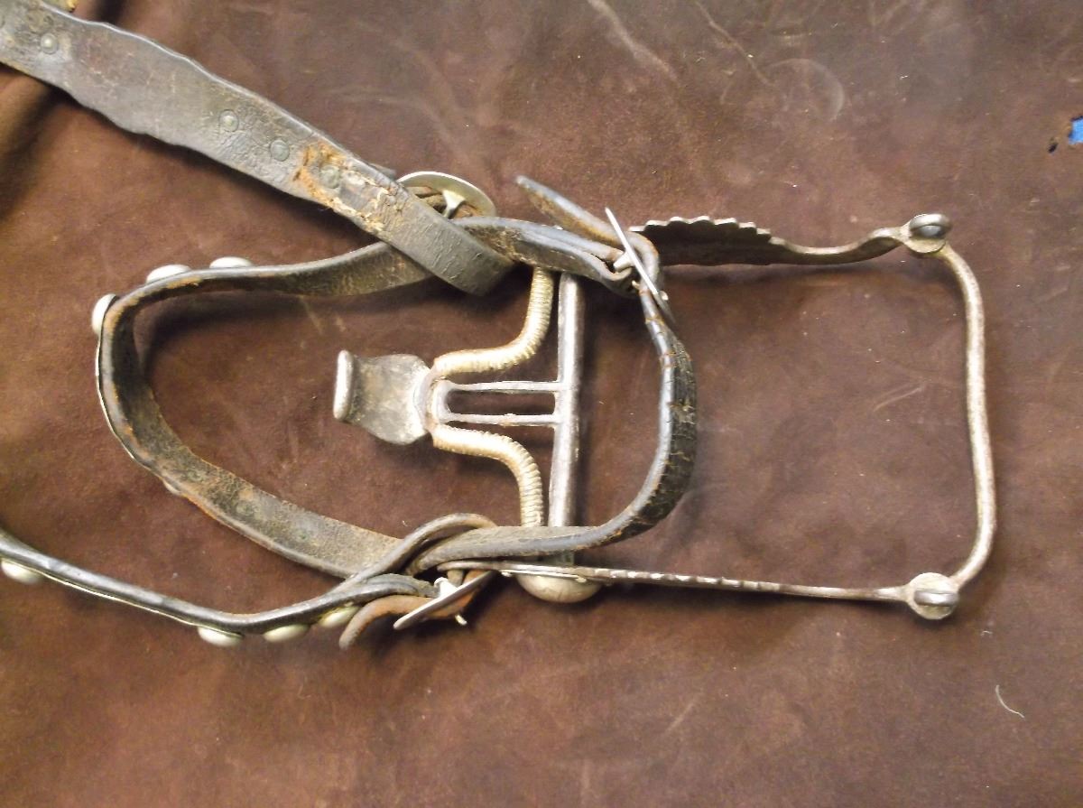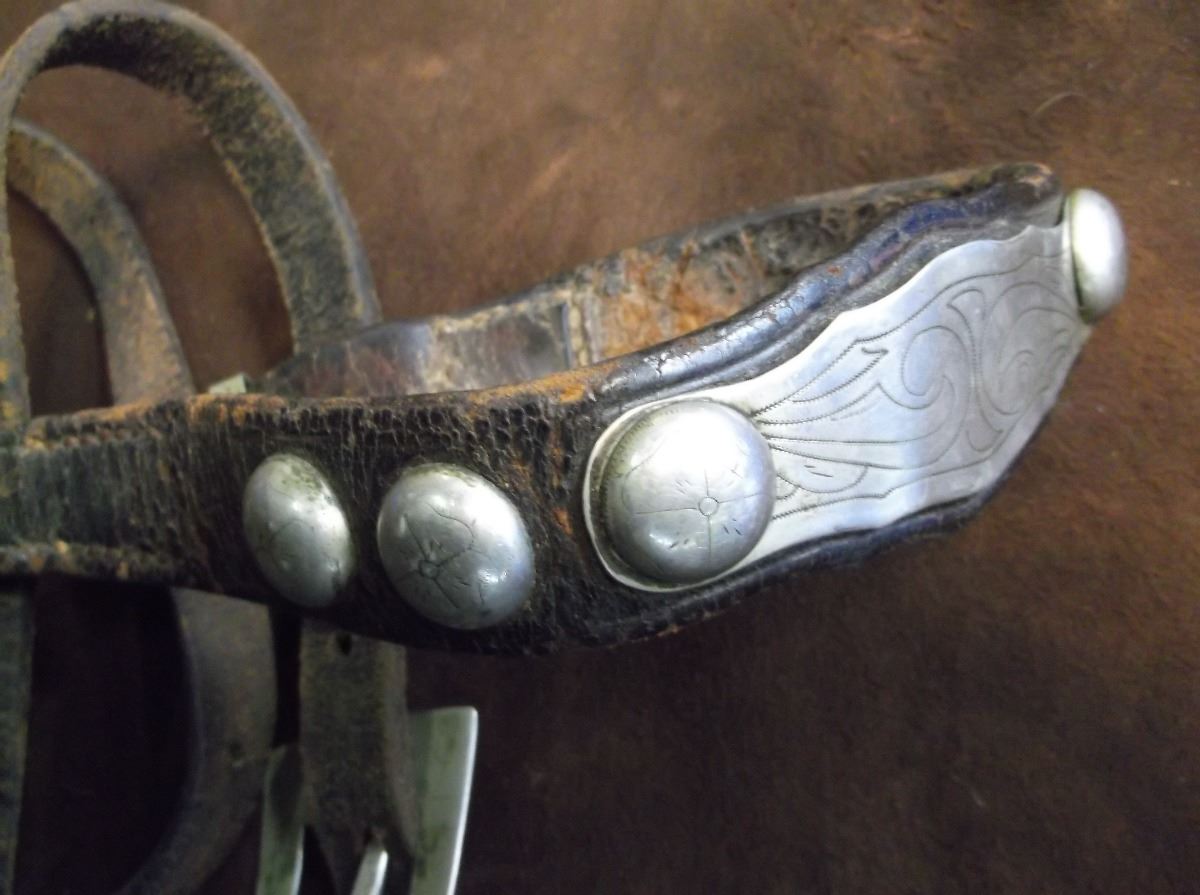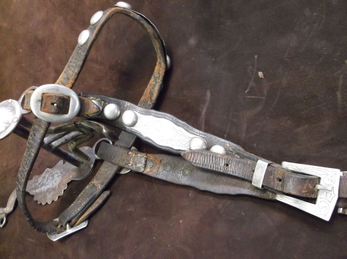 Unmarked Silver Inlaid Bit, Sonora Cheek –Spade Mouth, Spade is damaged, Slobber Bar, Unmarked Walla Walla Prison, Silver Headstall, “P” engraved on buckles