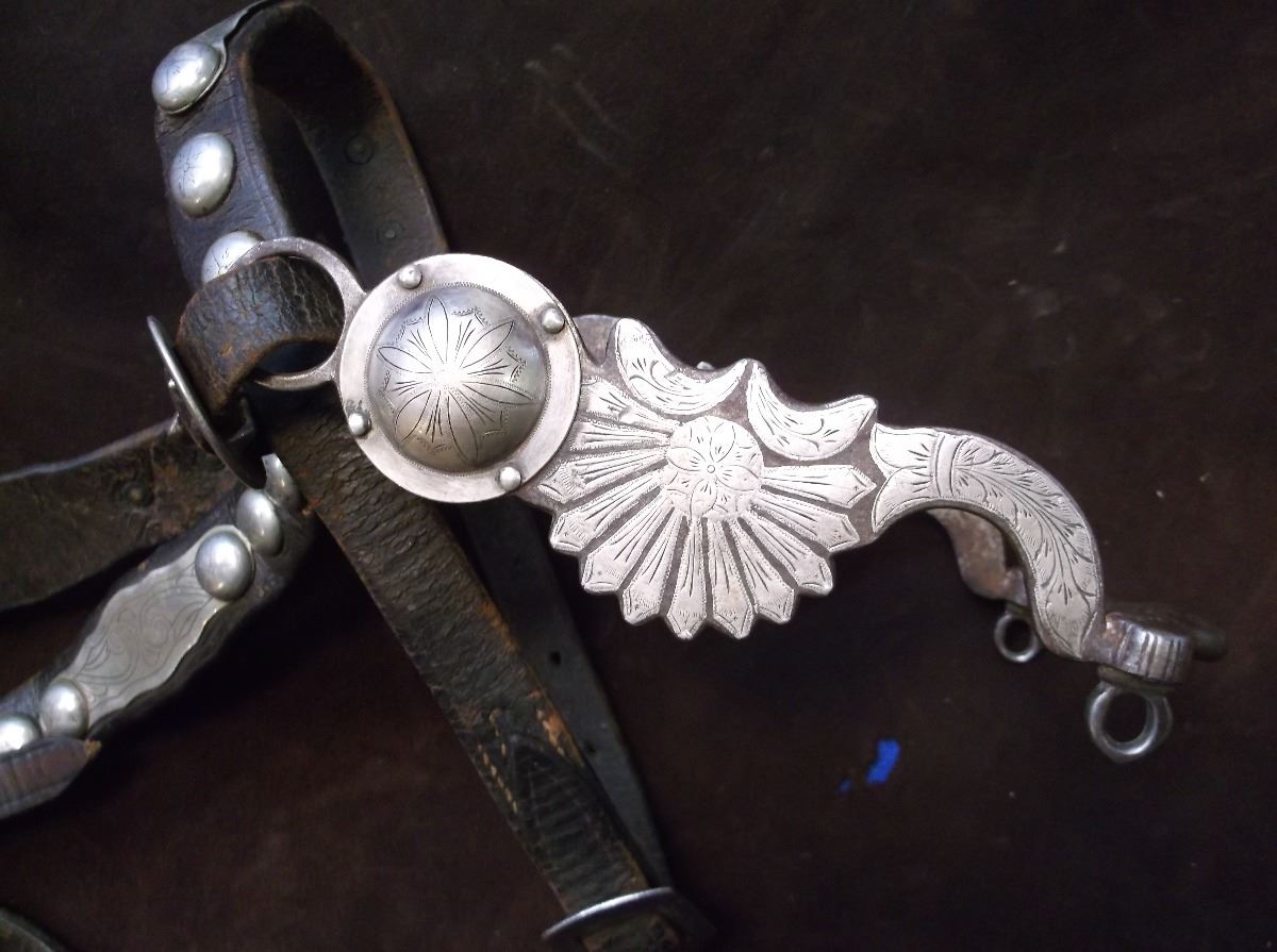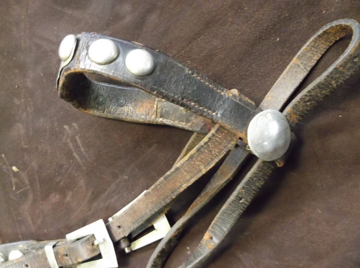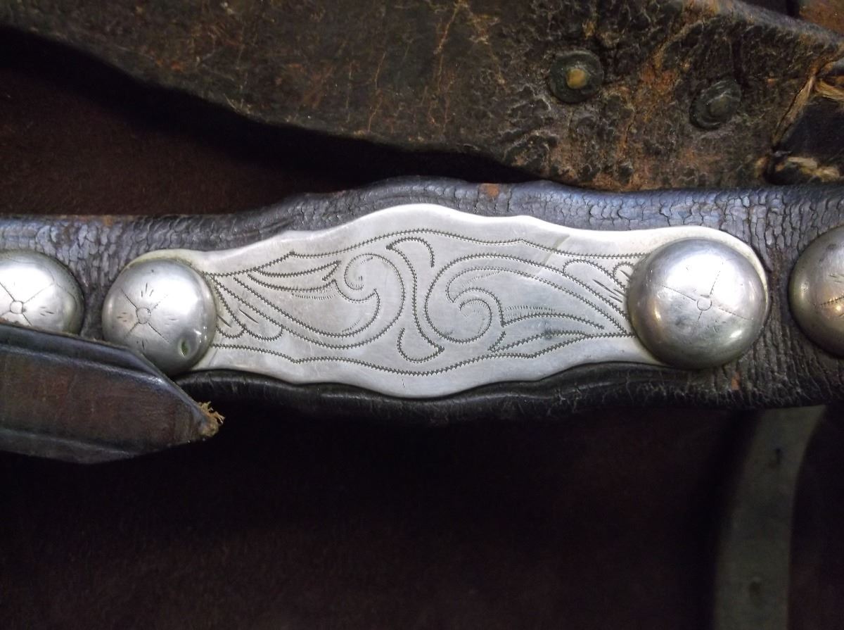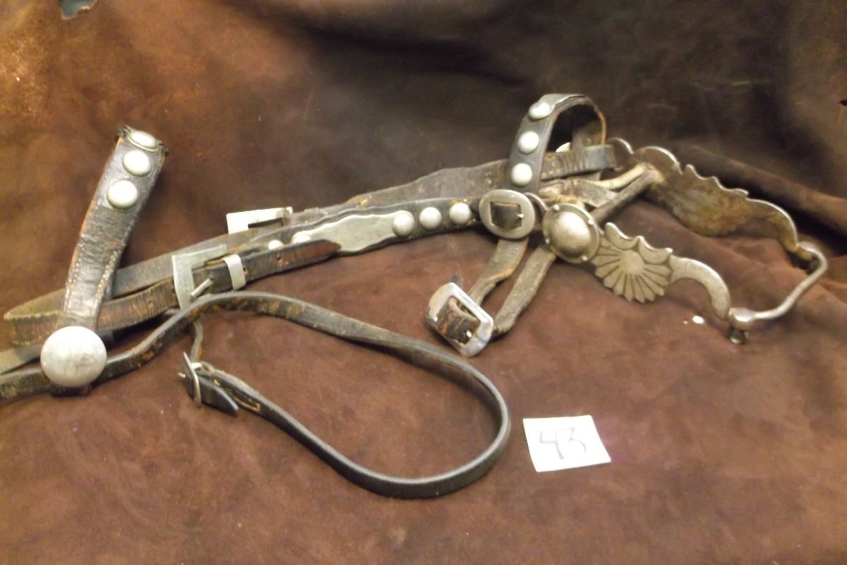 Unmarked Silver Inlaid Bit, Sonora Cheek –Spade Mouth, Spade is damaged, Slobber Bar, Unmarked Walla Walla Prison, Silver Headstall, “P” engraved on buckles