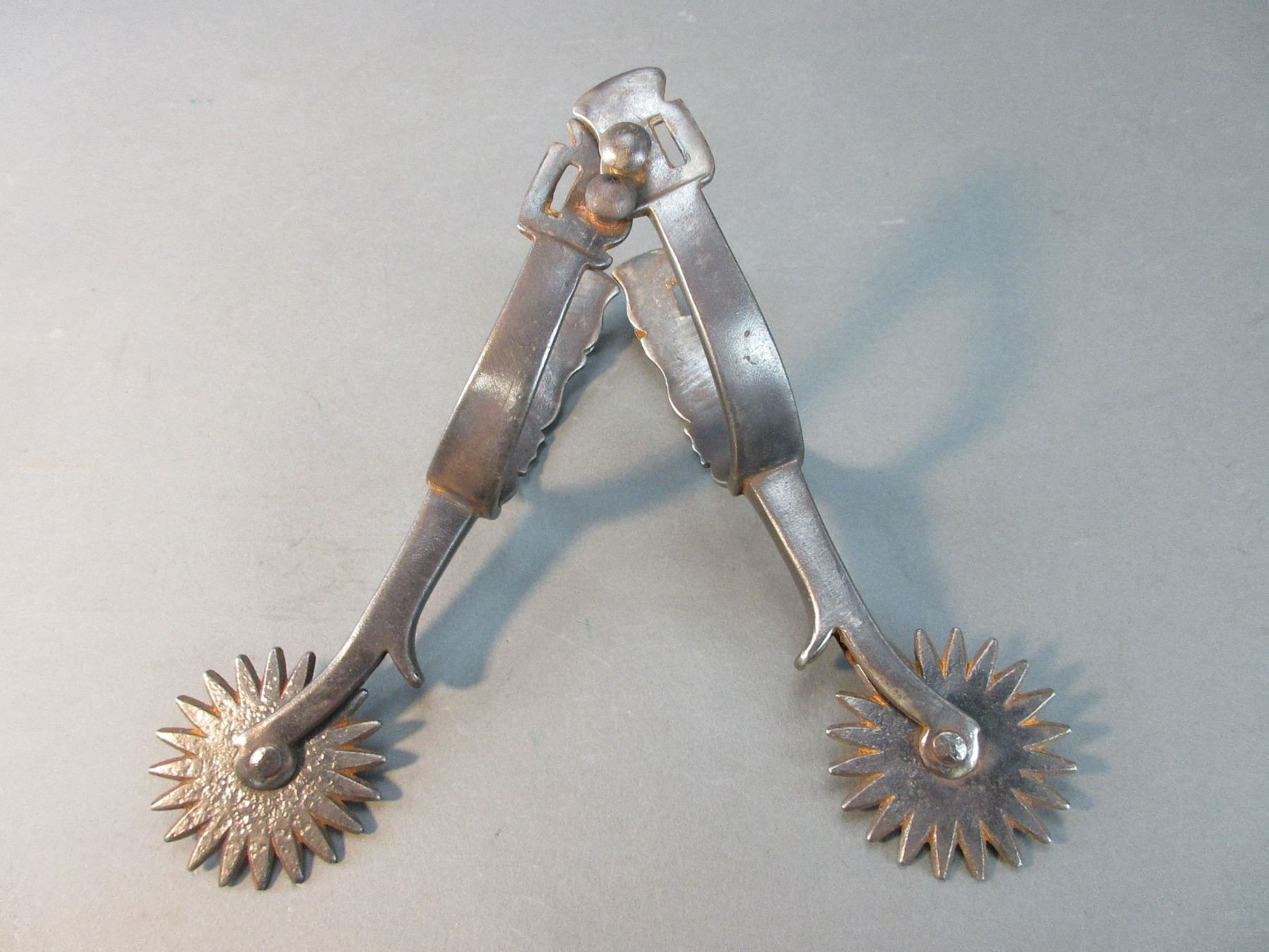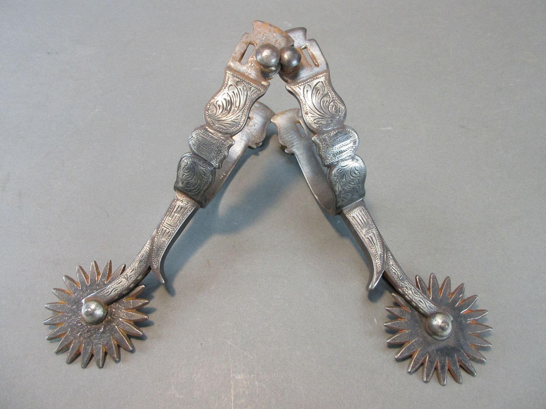 Unmarked Silver Inlaid Shield Pattern Spurs- .9" Bands- 3.25" Shanks- 2.25" 20 Point Rowels- Chap Guards- Fair Condition - Attributed To Mike Morales- Looks Like The M's Have Been Buffed Out Inside The Band