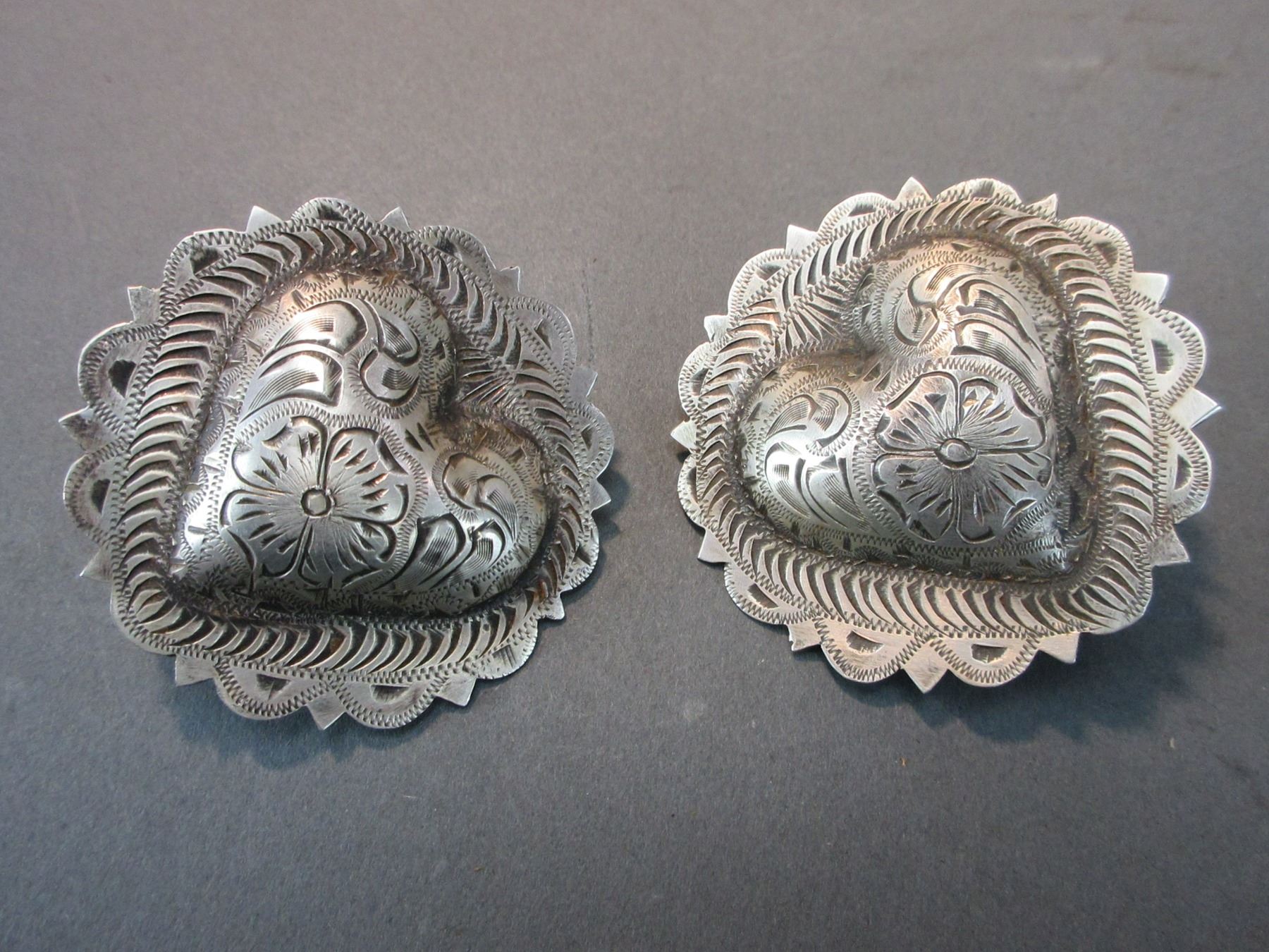 Unmarked Sterling Heart Conchos- Scalloped- Engraved- 2"