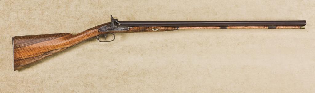 Unmarked SxS percussion shotgun, 10 gauge, 29-1/2” barrels, engraved and inlaid lock plates, fancy wood stock, #NVSN. This gun is in overall very good condition showing a dark brown patina overall on metal surfaces; fair bores, crisp actions, beautifully grained wood stock that is in overall very good condition; steel butt plate; brass tipped wood ramrod. Est.: $600-$1,200.