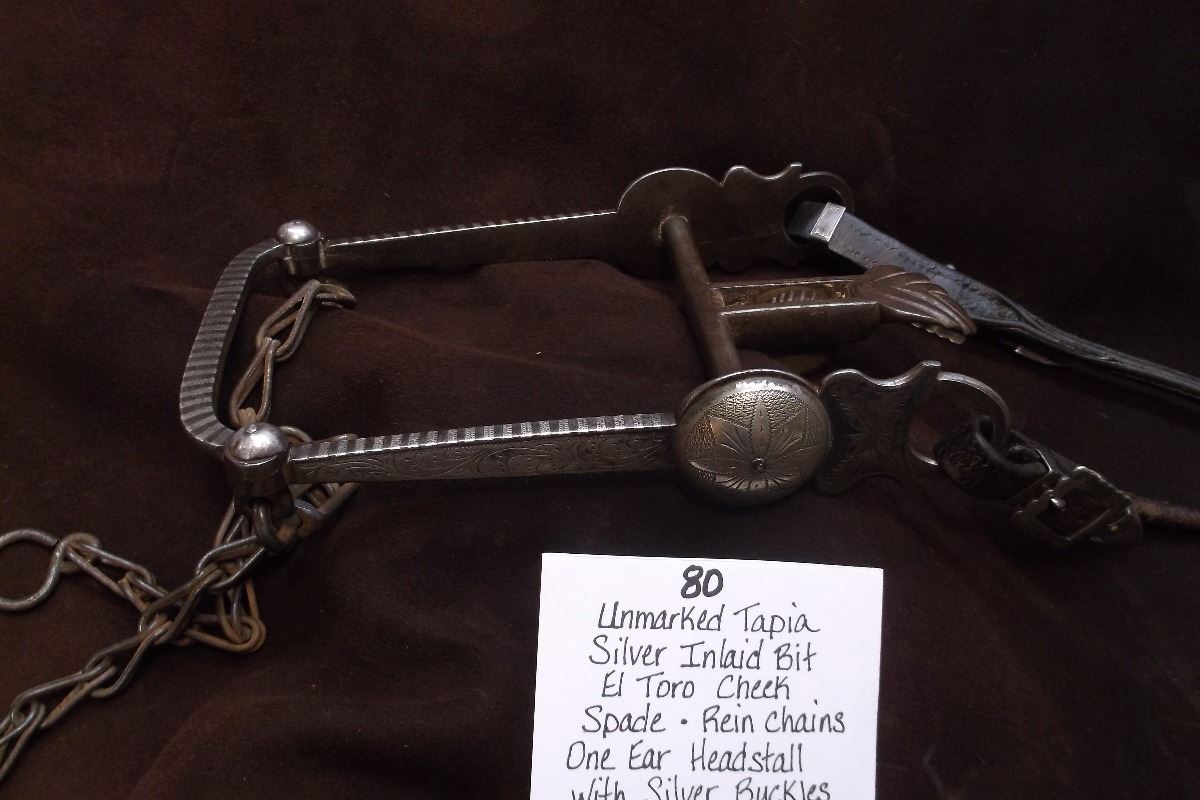 Unmarked Tapia Silver Inlaid Bit- El Toro Cheek- Spade- Rein Chains- One Ear Headstall with Silver Buckles