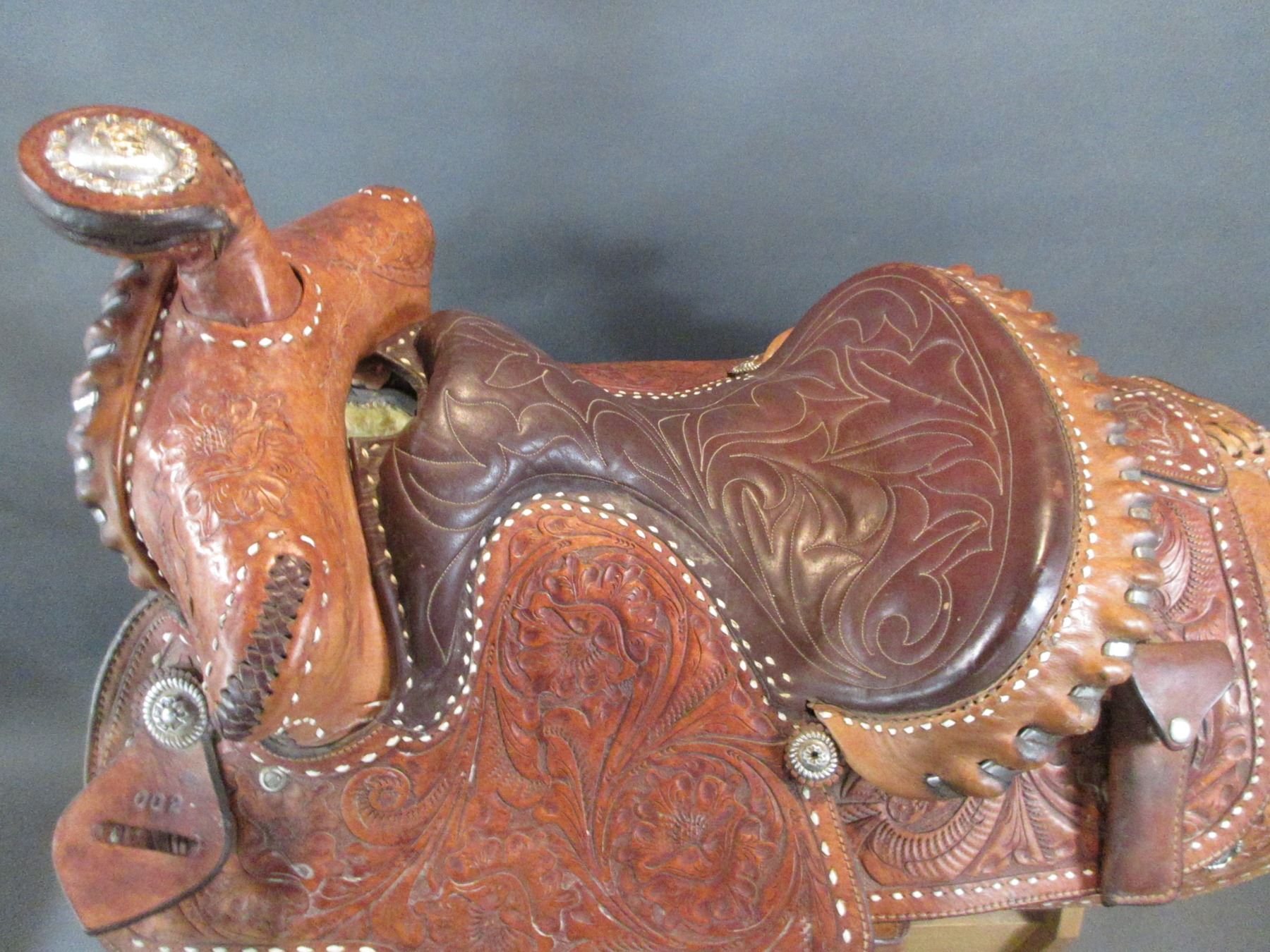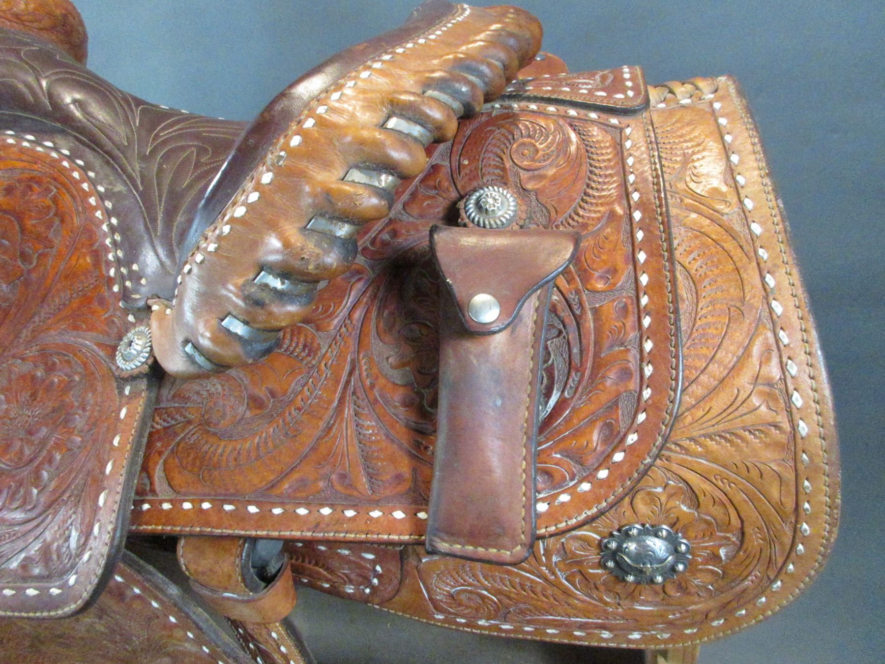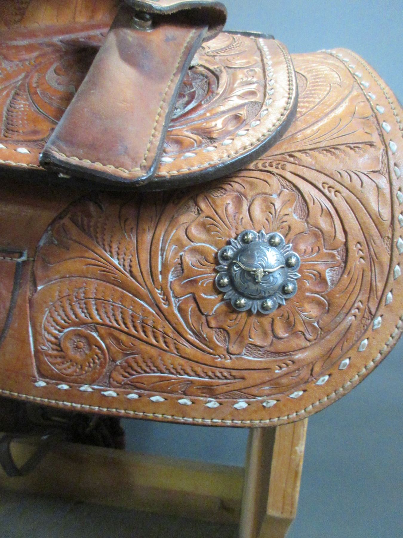 Unmarked Western Tooled Saddle- 15.5" Padded Seat Saddle- Good Sheepskin- Buckstitched- All There- 2.5" Horn Cap Silver Concho- Nice Saddle