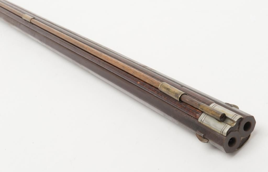 Unmarked and hand made over and under swivel barrel Kentucky style flintlock with incised carved stock. Approximately .36 caliber smoothbore. The gun measures 57 ½” overall with 40 ½” barrels. This gun shows good qualityworkmanship and has some age but is later than the period that it represents and is probably a 1950s or 60s handmade reproduction. The quality of work is very good and the stock is nicely made. Cost replacement over $10,000 at today’s customgunsmith prices and a few of craftsman would attempt making such a difficult project. Est.: $1500-$3000