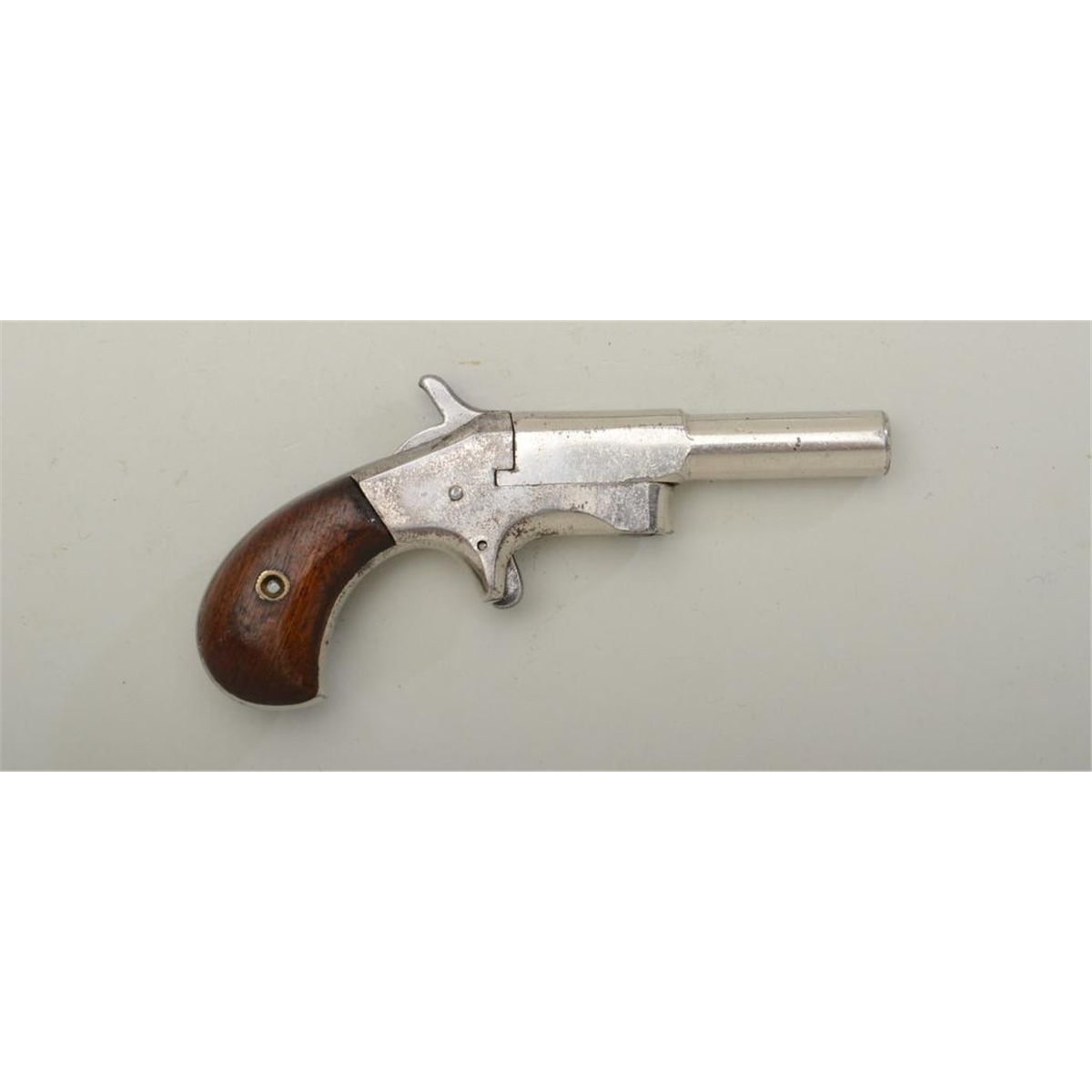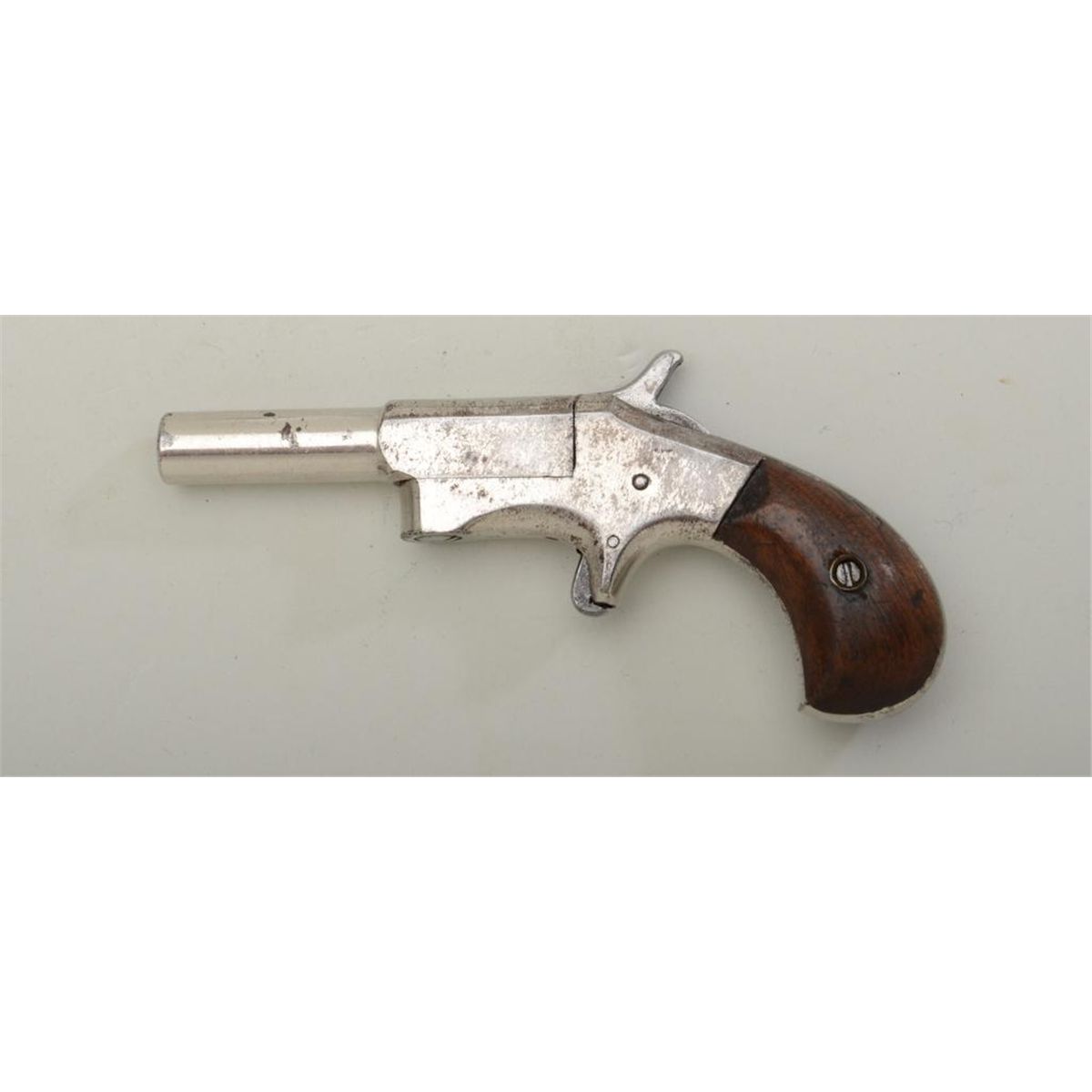 Unmarked antique single shot derringer (similar to a Marlin single shot derringer), .32 cal., 3” barrel, nickel finish, wood grips, #NVSN. This gun is in overall very good to fine condition showing approx. 55%original finish, overall good bore, action and grips. Est.: $100-$200.