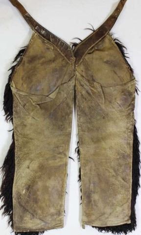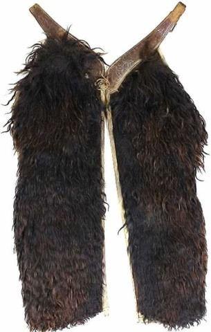 Unmarked black woolie chapscanvas lined, showing moderate use, unaltered, 38". Est. 400-700