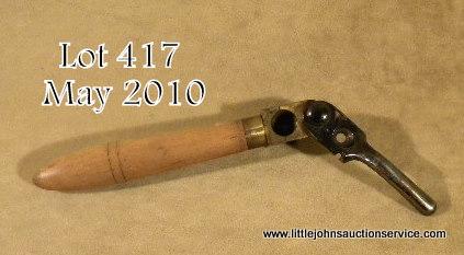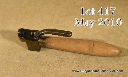 Unmarked brass bullet mold with iron cutter and wood handle, possibly for a Starr revolver in overall good condition; approx. 5-1/2” overall. From the Victor Stouffer Collection. Est.: $75-$150.