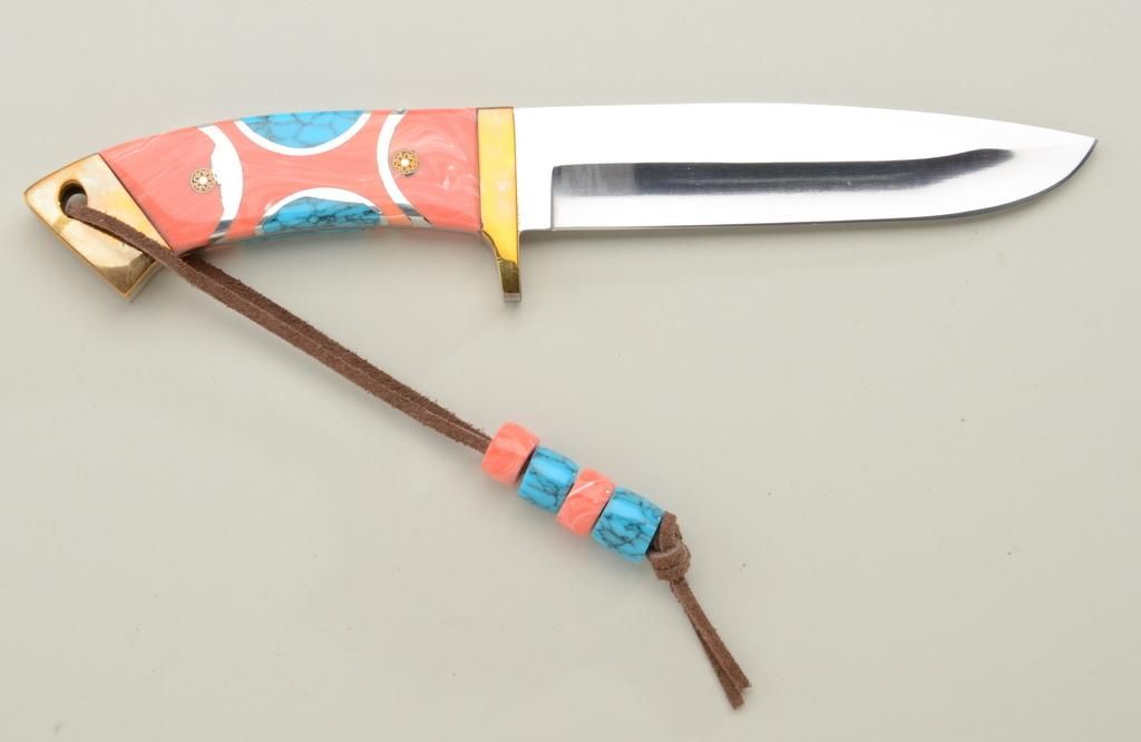 Unmarked custom knife with pink and light blue grip with matching beaded drop in like new condition approx. 11” overall with an approx. 6” blade. Est.: $250-$500.