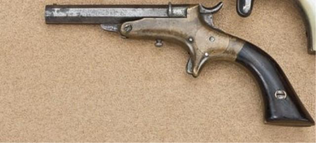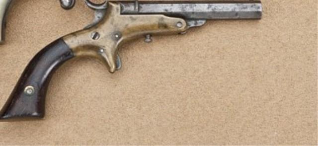Unmarked early American tip-up pistol, mid to late 1860’s similar to Stevens. .22 rimfire. 3-1/4” barrel, 6-1/4” overall, brass frame, underhammer release for hinged barrel, and knurled finger ridge which is cut through for sighting. Serial #73 on interior. Good condition showing brass patina finish, dark patina on the frame, good rosewood grips that are serial numbered to match. Action good, bore slightly rough. No markings other than serial number. An interesting American single shot that could quality as a vest-pocket derringer. Est: $300 - $600