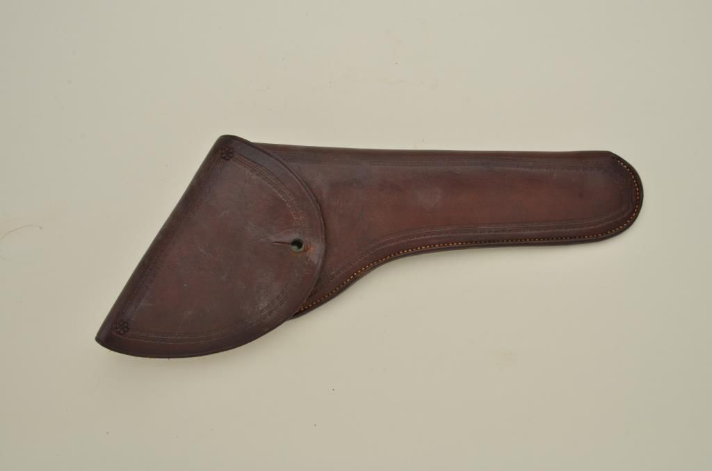 Unmarked flap holster for a Colt New Service revolver, 7-1/2” barrel, original belt loop, fine condition and stitching. Est.: $150-$300.