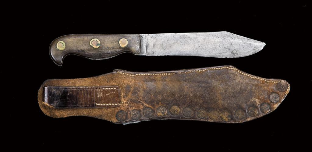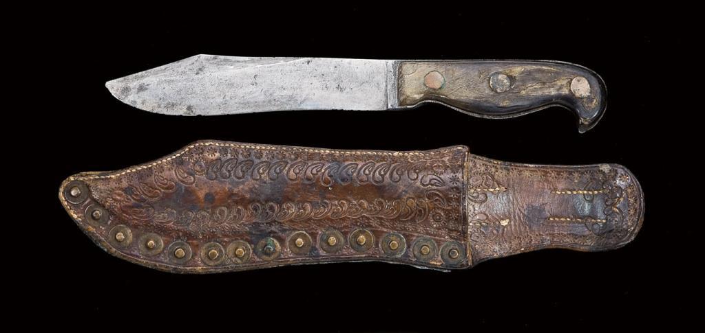 Unmarked, hand-made skinning knife in the California style. Approx. 10-5/8” overall, 6-1/8” clip blade, made from 1/4” stock. Clip blade with a round false edge. The birds-head hilt has horned scales with three brass and copper rivets. The tang tapers from the ricasso to the pommel. Blade has been sharpened significantly with minor nicks to the blade edge and slightly tipped. Overall aged patina with spots of light pitting. Significant wear and flaking to the horned scales. With original period tooled-leather sheath with brass harness rivets and belt loop. This knife has a great deal of character. Hugh Hayes Collection. Est: $3,000 - $6,000