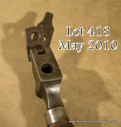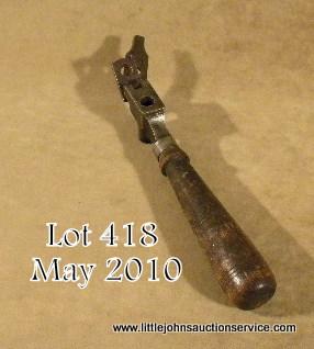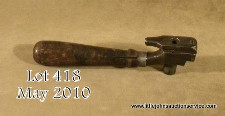 Unmarked iron bullet mold with iron cutter and large wood handle, possibly for a Starr revolver in overall fair condition as cleaned and with a crack in the wood handle; approx. 8” overall. From the victor Stouffer Collection. Est.:$75-$150.