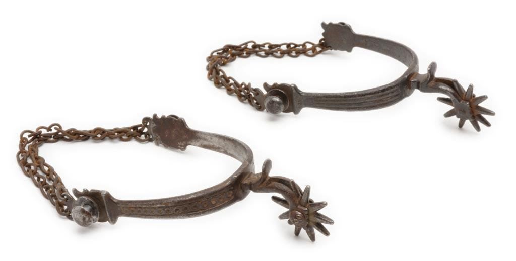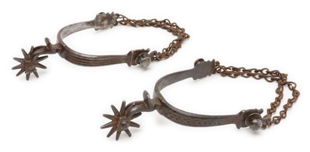 Unmarked iron spurs with 1-1/2” 10 point rowels and heel chains; heavy dark patina. Est.: $300-$500.