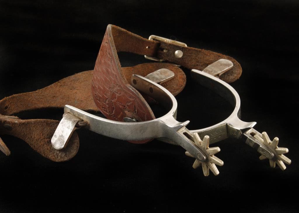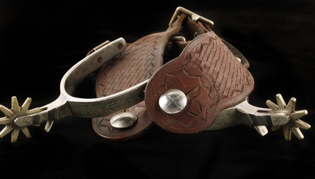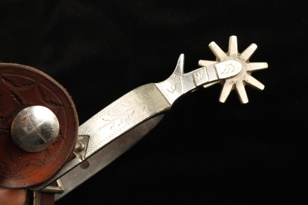 Unmarked pair of spurs with German silver engraved inlays and old basketweave tooled straps. Est.: $100-$300.