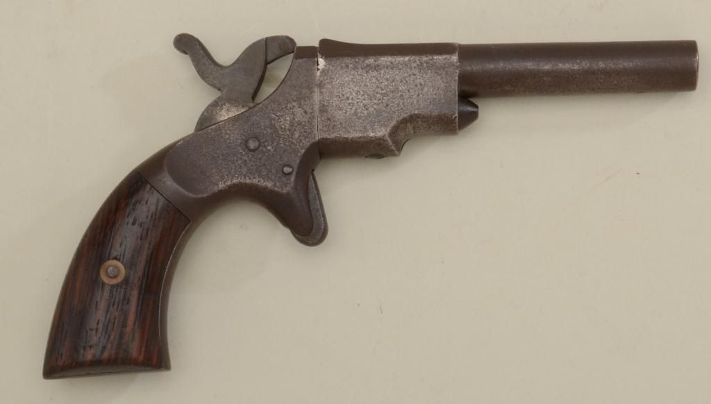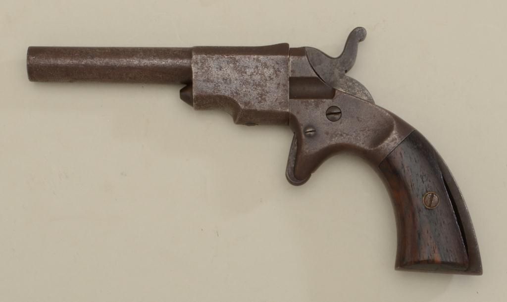 Unmarked spur trigger single shot pistol showing dark patina over scattered pitting, dark bore, action not working, rosewood grips with rear portion of left grip missing. Est.: $100-$200.
