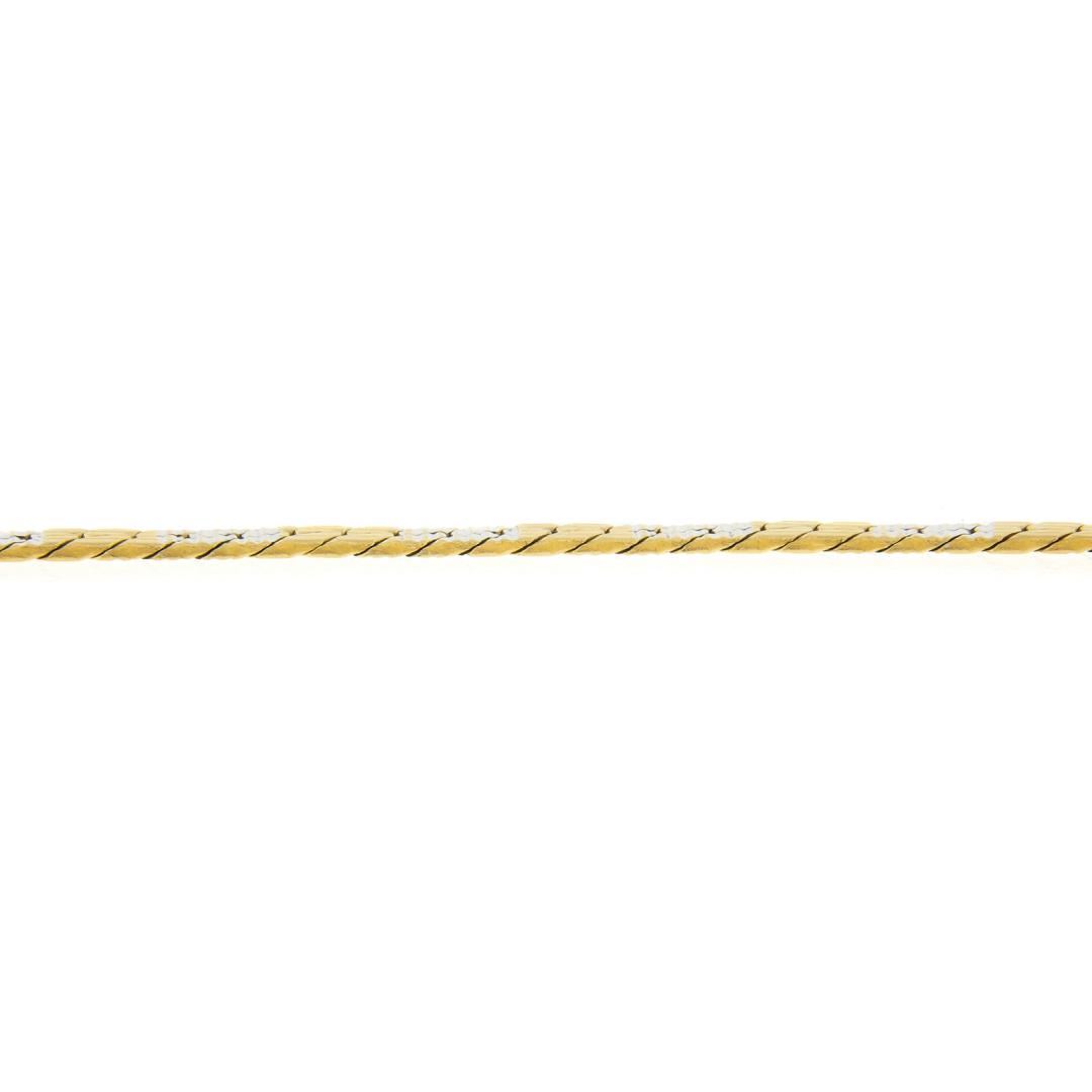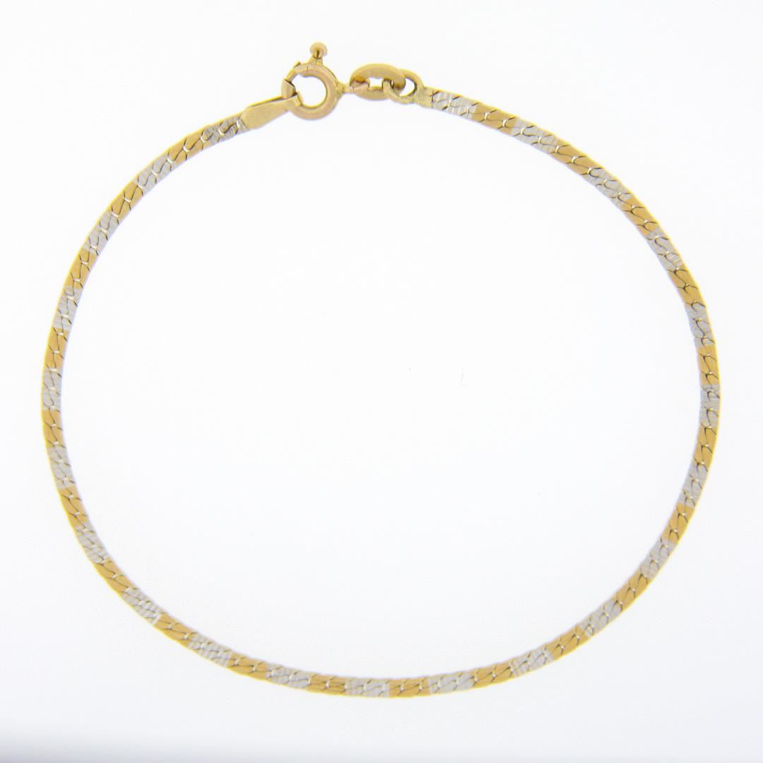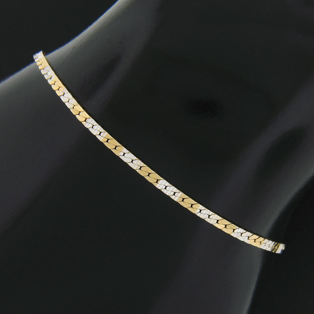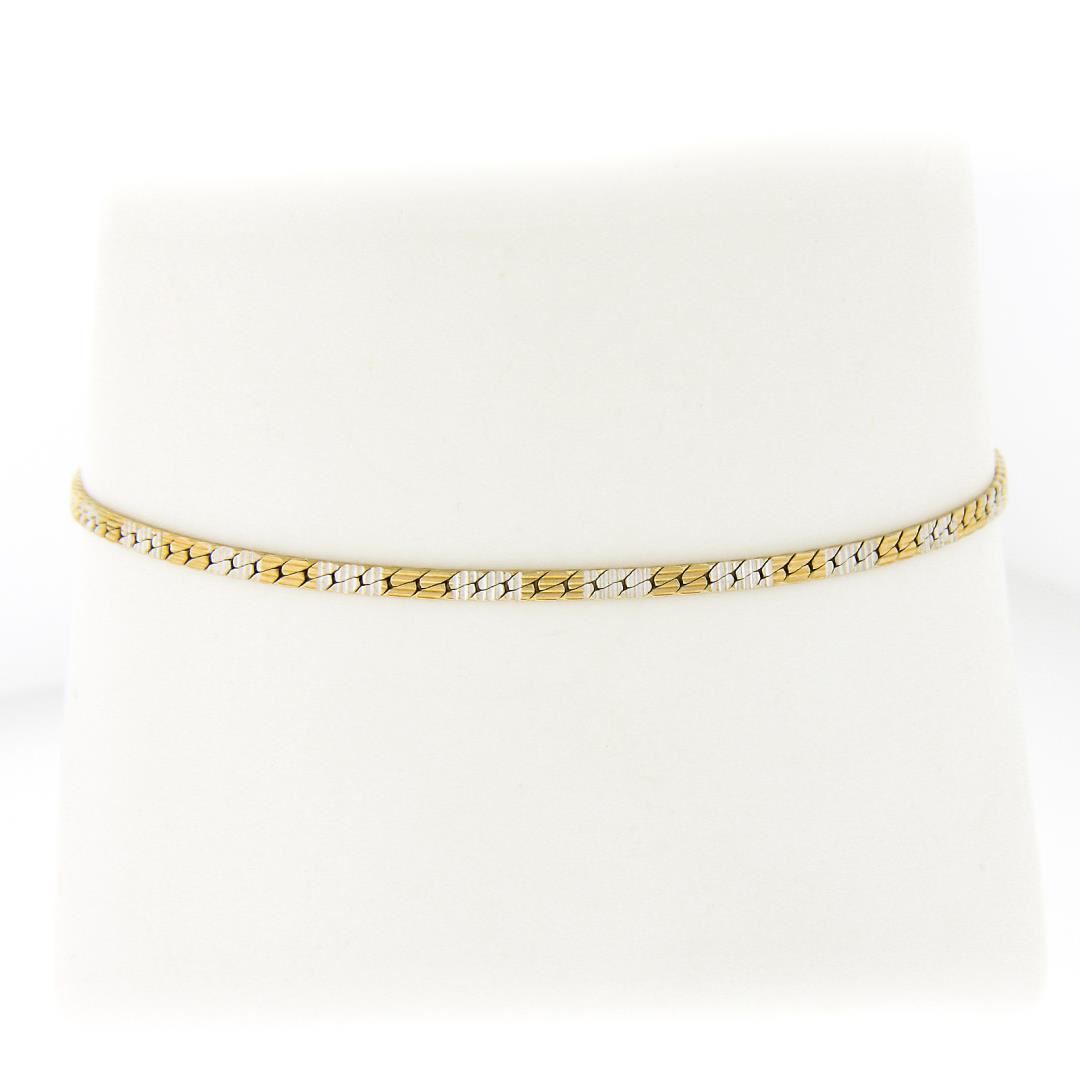 A solid italian 14k yellow & white gold flat link bracelet by UNOAERRE. It weighs a total of 2.24 grams, measures 1.8mm wide, and measures 6.75 inches in length.