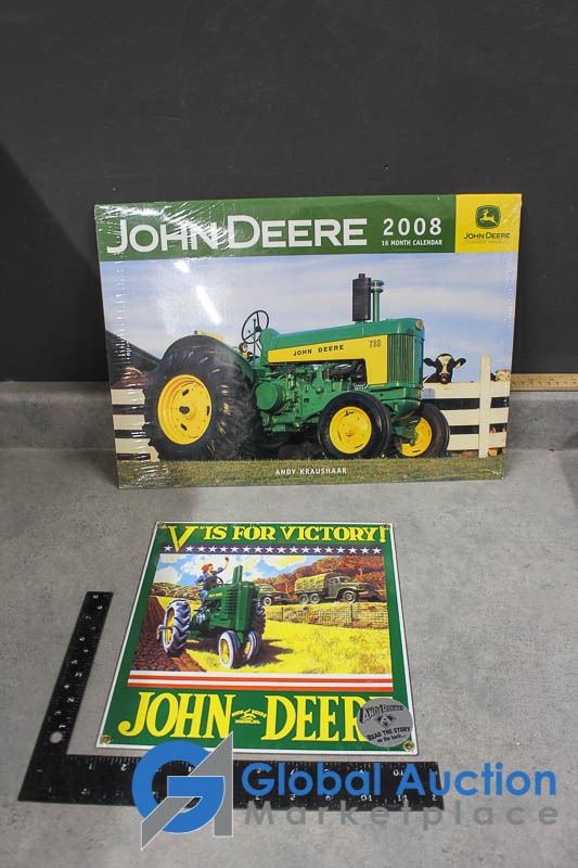 Unopened 2008 John Deere Calendar and V is for Victory Tin Sign