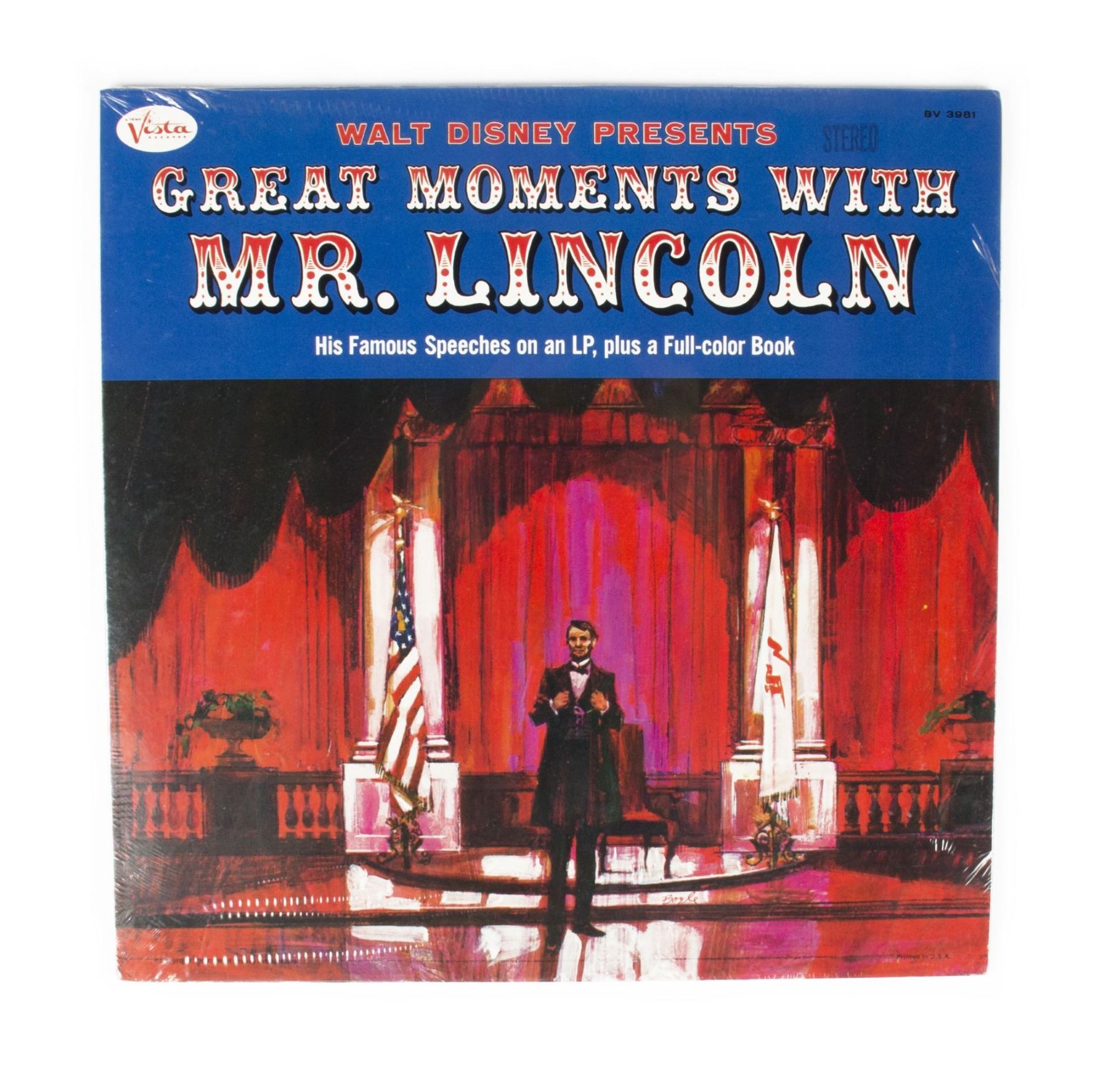 (Disneyland, 1964) An extremely rare unopened record titled "Walt Disney Presents Great Moments with Mr. Lincoln" featuring several of Lincoln's speeches plus a full-color book. The record was created for the World's Fair version of the attraction, as it would not come to Disneyland until 1965. However, this particular unopened record was sold at Disneyland, and still retains its original Disneyland sales sticker on the back side. Measuring 12.5"x12.5", this record is in very fine condition with minor edge-wear.