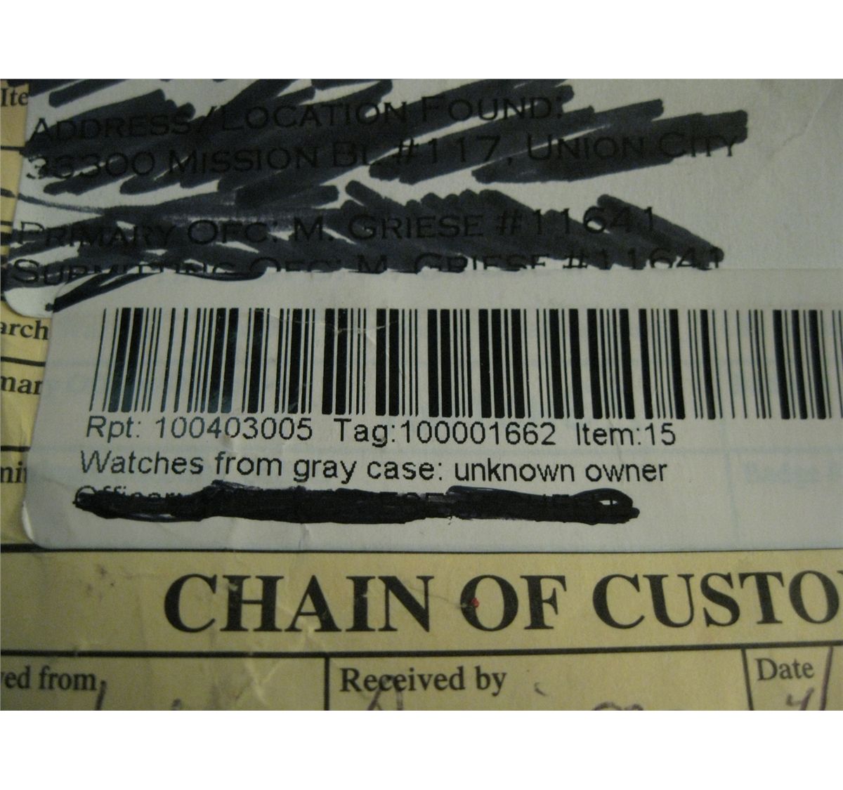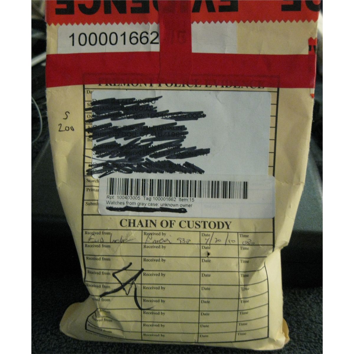 Manila Envelope Stating " Watches" . Envelope has not been opened. Evidence Property Received From Police Dept.