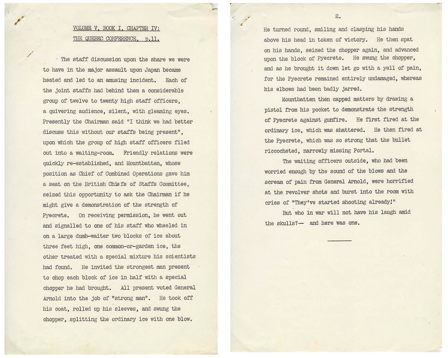 Unpublished draft from Winston Churchill's WWII memoir, ''The Second World War'', here recounting an amusing (and previously anecdotal) story of Lord Mountbatten shooting a pistol at a block of Pykrete, a new technology mimicking ice. Draft is possibly from Churchill's own typewriter, distinctive for its larger font, and comes from the estate of Commodore Gordon Allen, who helped Churchill write the naval portions of the memoir.