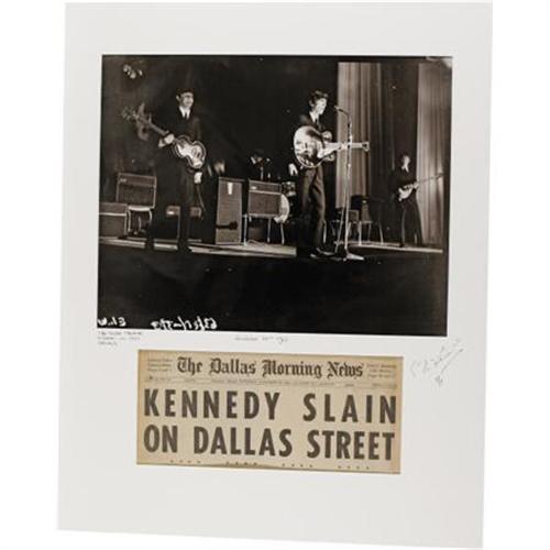 <B>Unpublished Ian Wright Photograph of The Beatles, 1963.</B></I> A large-format, unpublished sepia b&w silver gelatin print of The Beatles at the Globe Theatre in Stockton, England, November 22, 1963, taken by photographer Ian Wright. The accompanying newspaper headline from <I>The Dallas Morning News</B></I> reads: "Kennedy Slain in Dallas Street," and is significant in that this photo was taken at precisely the same time (given the time difference) as the shooting. A poignant coincidence, captured by the photographer Ian Wright in this display, matted to an overall size of 24" x 30." The presentation is signed and numbered by Wright (1 of 1). In Excellent condition.<BR><BR><b>Shipping:</b> Flat Material, Large (<a target="_blank" href="http://www.heritageauctions.com/common/shipping.php">view shipping information</a>)