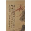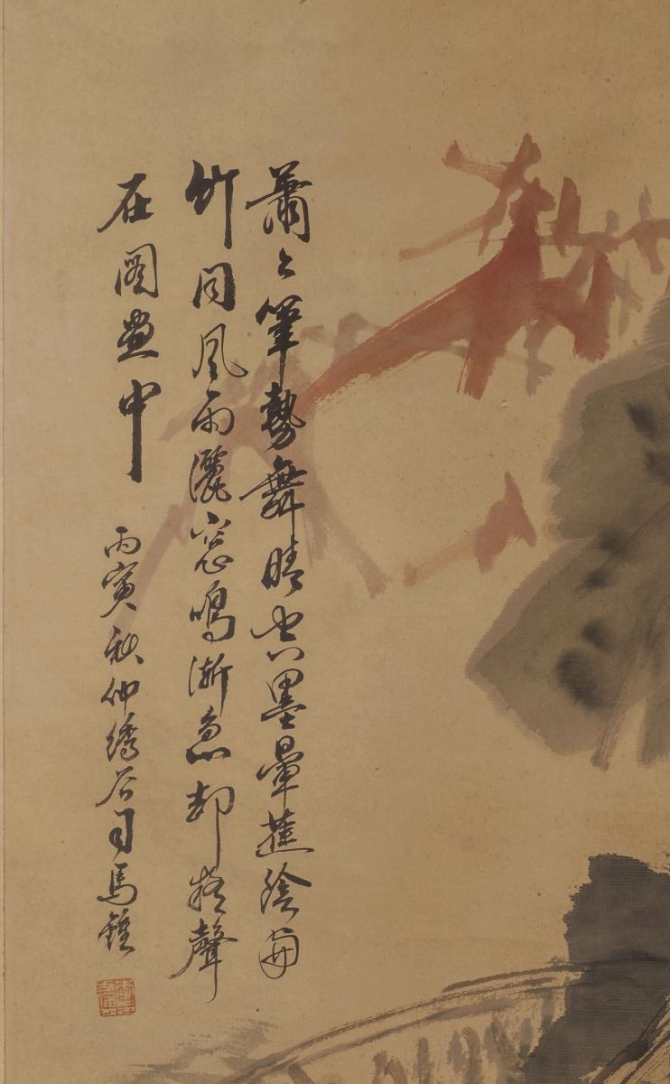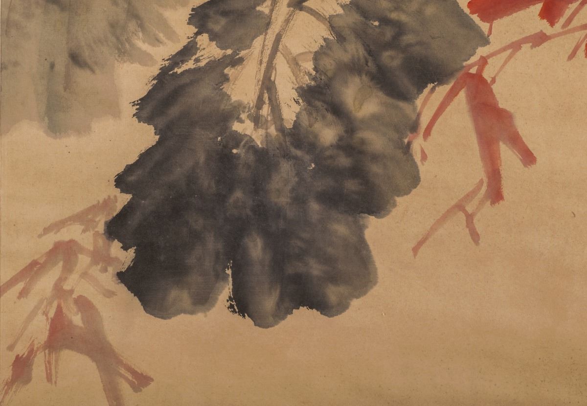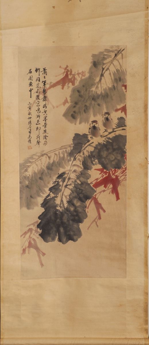 Color and ink on paper. Painted with two delicate designed birds in light brown tone. Facing to the front, standing quietly on branch. All set within the landscaping and large leaves.