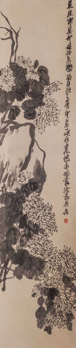 A fine Chinese ink painting of blooming chrysanthemum flowers, painted in extremely detailed. Decorated with vivid leaves.