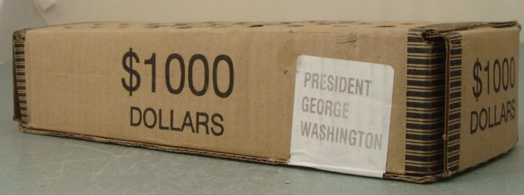 This $1,000 unopened mint box contains 40 bank wrapped rolls of the 2007 George Wasington Presidential Dollar. Each roll contains 25 coins. All coins are mint and uncirculated. This box is dated 2-7-07, and has never been opened. This is about the same time that all the mint errors were discovered on the Washington coins--could have a few big winner error coins!