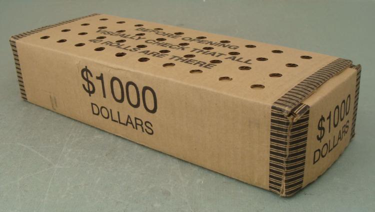 This $1,000 unopened mint box contains 40 bank wrapped rolls of the 2007 George Wasington Presidential Dollar. Each roll contains 25 coins. All coins are mint and uncirculated. This box is dated 2-7-07, and has never been opened. This is about the same time that all the mint errors were discovered on the Washington coins--could have a few big winner error coins!