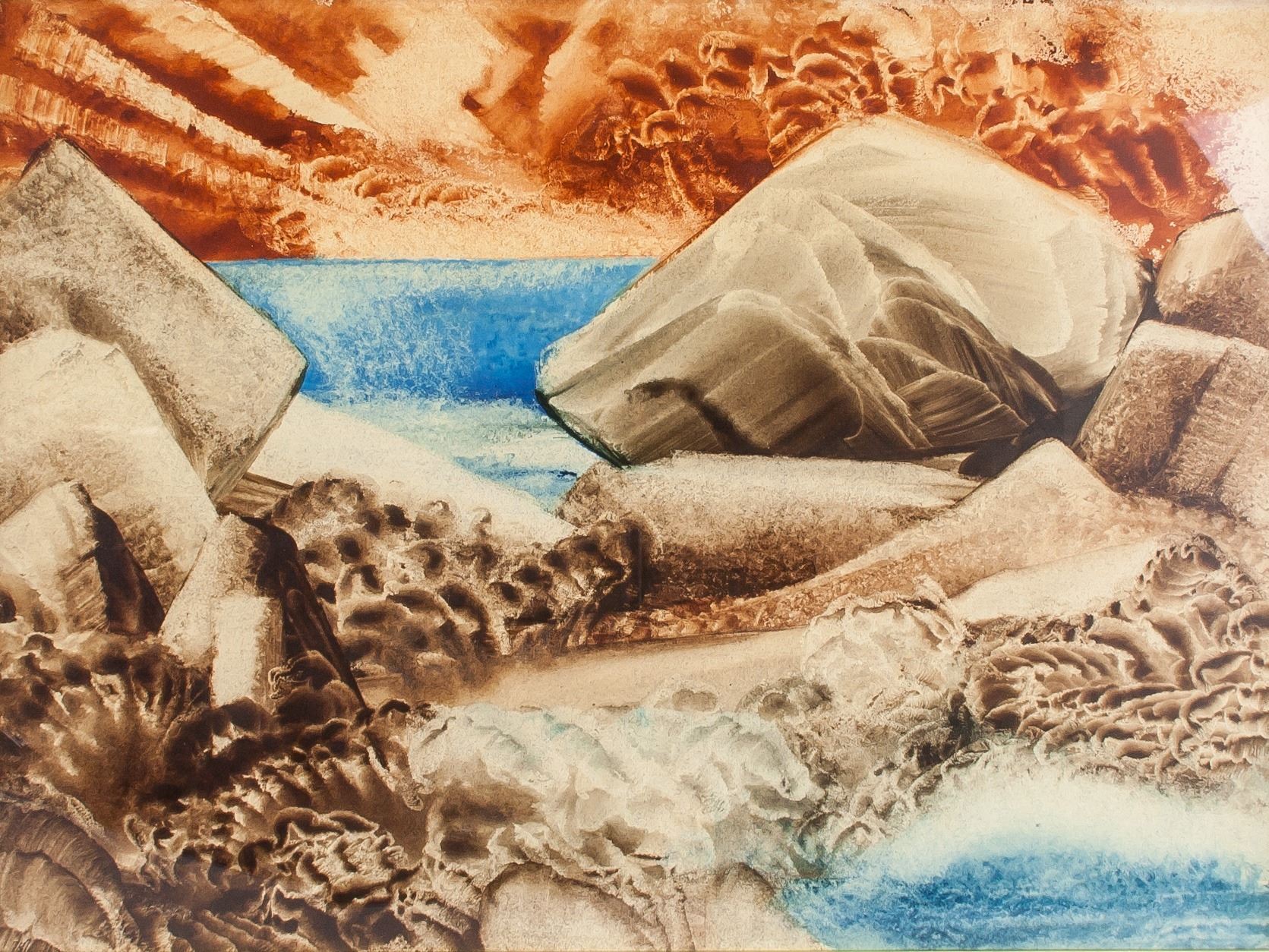 Watercolor and charcoal on paper. Featuring coastal landscape scene. Unsigned. 14.2 x 19.3 in. (36 x 49 cm)