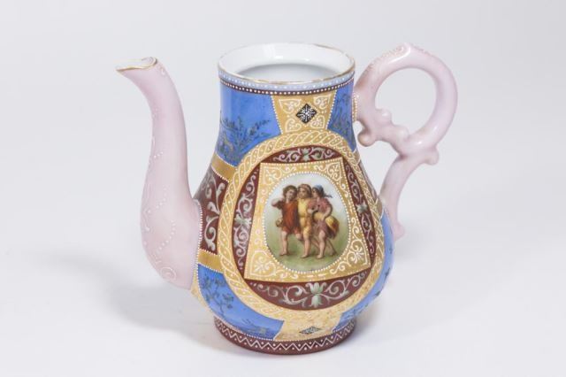 Including round tray, approx. 14 1/2" W; teapot, approx. 6 3/4" H; sugar, creamer, and cup & saucer. (6031)
