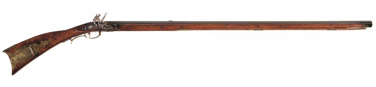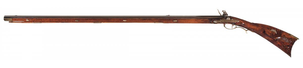 There are no visible markings on this rifle, however the consignor notes state that this rifle was made by Jacob Anstadt. Dovetailed brass blade front and fixed iron rear sights. Lightly engraved rear of the lock and hammer side, wooden ramrod secured by three brass pipes, brass trigger guard with grip extension and mounted with a full maple straight grip stock with a brass forend cap, decorative brass patch box and buttplate, cheek piece with a silver inlaid crescent moon on the cheek piece and carving behind the cheek piece. Jacob Anstadt was a gun maker in Berks Count, Pa. from 1815 to 1817.