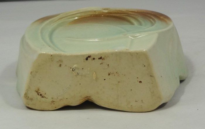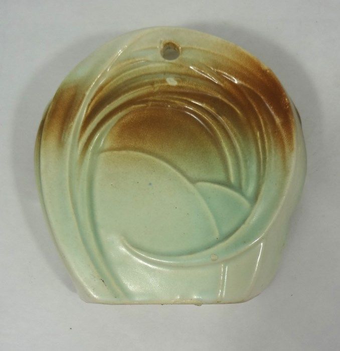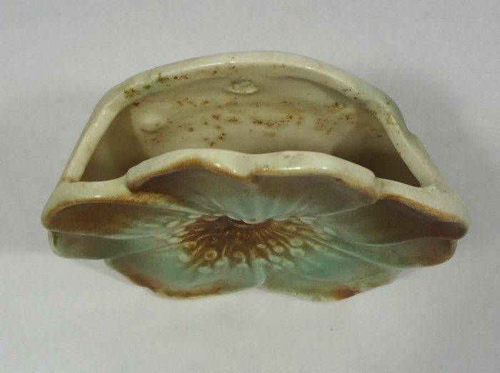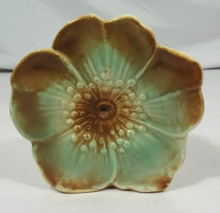 Unsigned McCoy brown and aqua flower wall pocket. A similar piece was found in Warman's "McCoy Pottery" book on page 248. 6" tall and 6" wide. Est Value $30.00-60.00