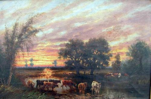 Unsigned, Oil on Canvas, Sunset with Cows in a Stream,11 1/2" x 17 1/2"