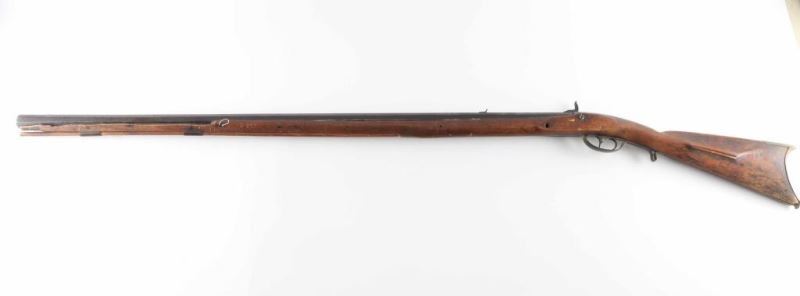 Single shot black powder rifle features browned finish, full length wood stock, 41" octagon barrel, blade front sight, "V" notch rear sight in dovetail, wood ramrod under barrel, double set triggers, semi-crescent buttplate, brass fittings. Bore shows brown color rust. Metal surfaces are browned, with some mottling and bare metal on edges, pitting all around nipple & bolster, pitting on front half of lock plate, patina throughout. Missing nose cap & barrel wedge. Wood is cracked many places, eroded around lock and at muzzle, missing parts of top edge along forend in several places. Set trigger not functional, internal mechanical issues. Condition is NRA Fair (action needs repair/adjustment) *** Antique Firearm ***
