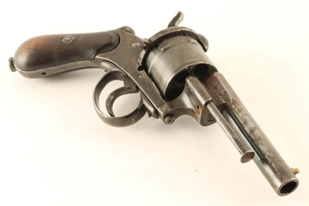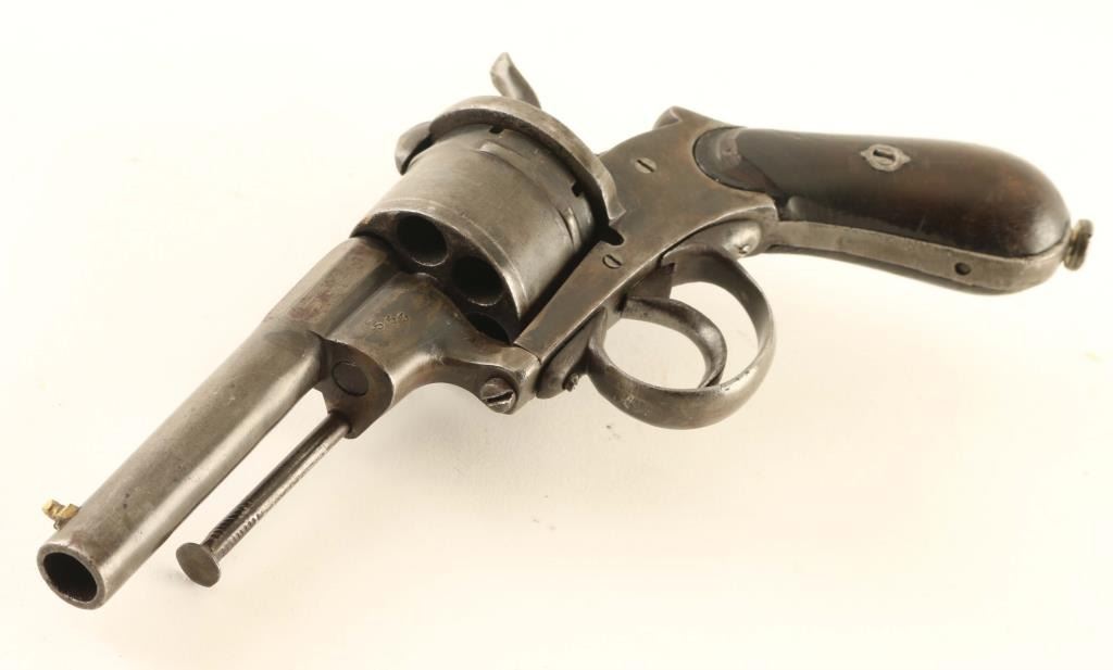 Features approx 4" barrel, 6 shot cylinder, side loading, ejector rod, double/single action. Bore is fair condition, dark with light pitting throughout, consistent shallow rifling. Charge holes are fair to good condition. Overall mottled grayish brown finish (appears to be cold blue) covers 65% of metal, thinning with visible signs of sanding in some areas. Grips are good condition, show some shrinkage. Cylinder rotates freely; action operates intermittently and inconsistently. Two piece frame has free play between sections. Condition is NRA Fair *** Antique Firearm ***