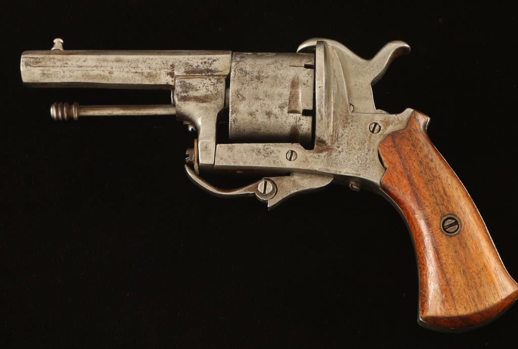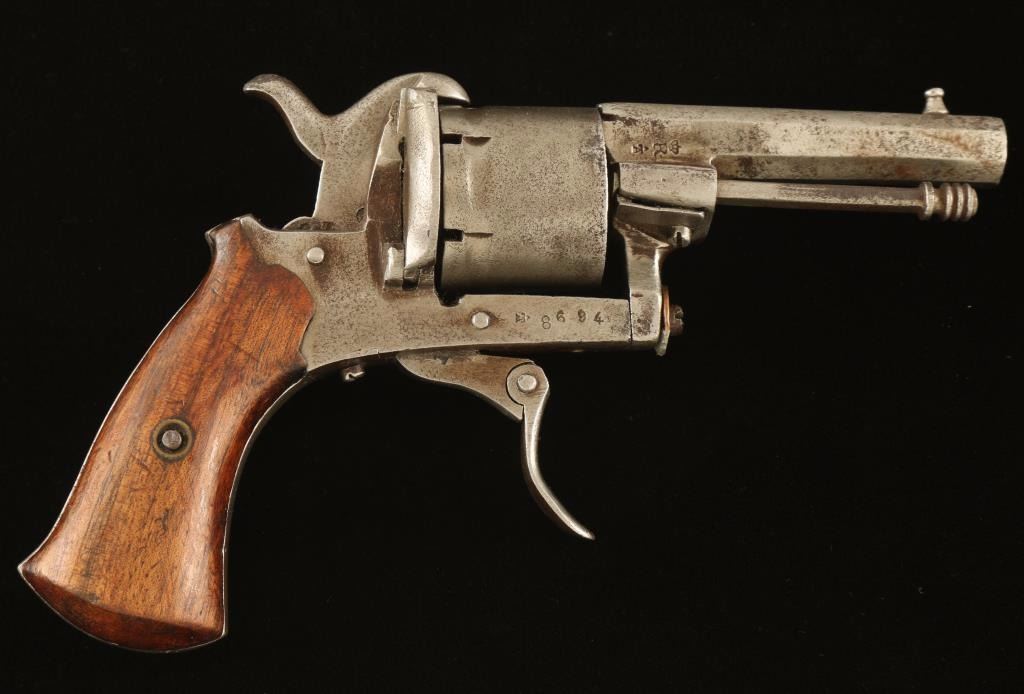 Belgium proofed small frame double-action Lefaucheux style pinfire revolver with an approximate 7.5mm bore, circa 1850's-1890's. Features a 2.6" octagonal barrel, cone front sight, ejector rod, non-fluted six-shot cylinder, smooth fold-down trigger, smooth hammer spur, and two-piece smooth wood grips. Revolver is primarily in-the-white with some areas of brown patina and dark pitting. Action performs in double action but the trigger will not reset fully & the hammer will not stay cocked in single action, bore appears good and wood grips are very good. Condition is good. ***Antique Firearm***