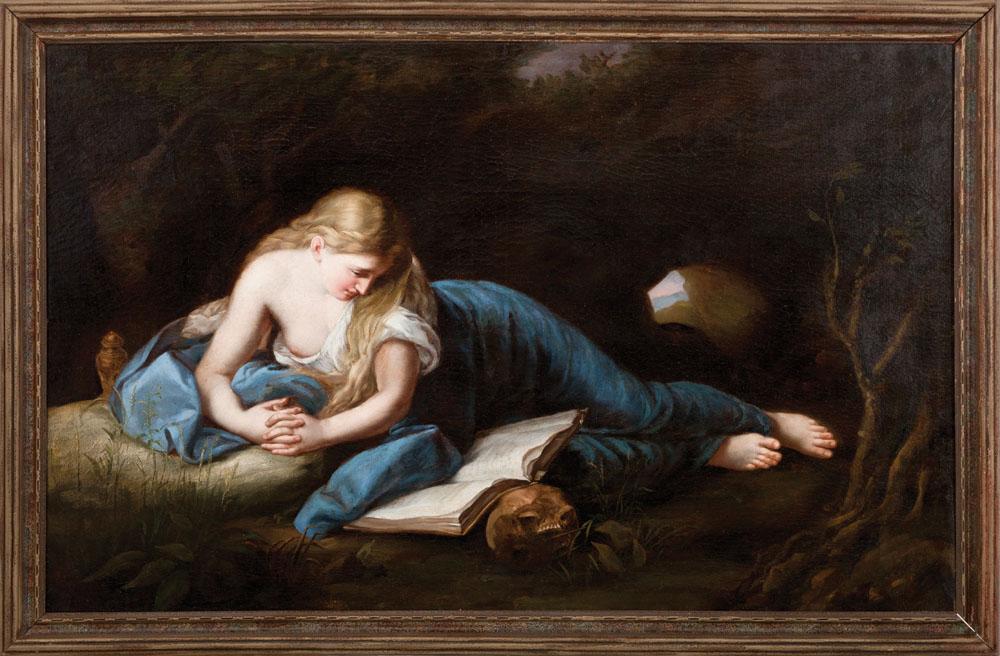 Classic reclining figure popular in the bars and saloons of the west, c. 1880s 29 1/4” x 46 1/4” Oil on canvas. Shows quality restoration. Surface age cracked.