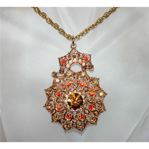 This is a large spectacular Vintage 1950s three dimensional Dome shaped Pendant Necklace set with a large center prong set Chaton Root Beer Rhinestones. Highlighted with smaller Root Beer and Tangerine Chaton Rhinestones, then highlighted with white glass seed beads. The Pendant measures 2 ¾ inches in diameter and the fancy link Necklace is 21 inches long closing with a spring-ring closure. Weight, well made and unsigned.