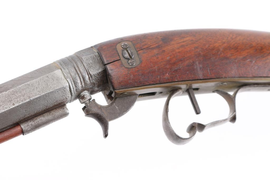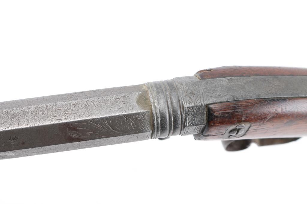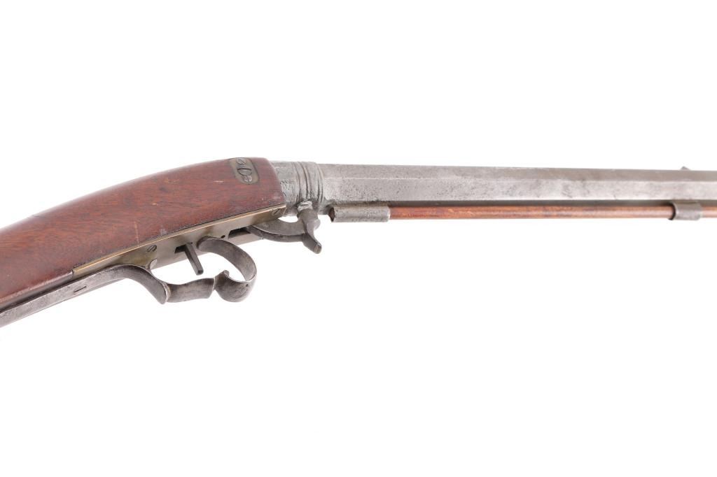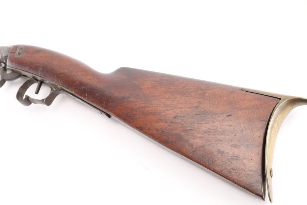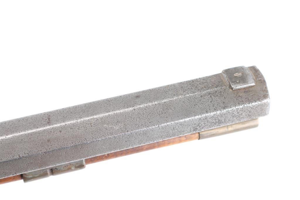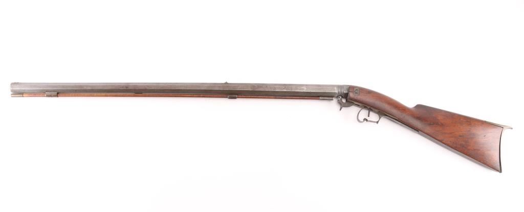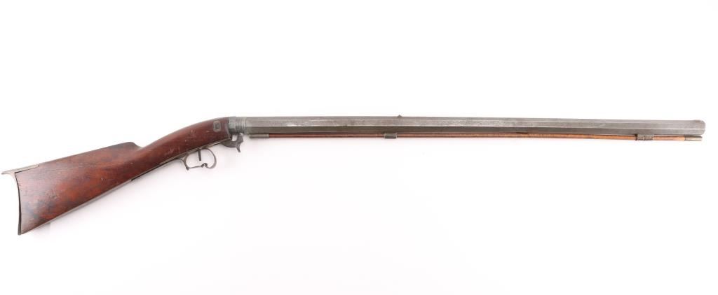Antique long gun appears to be a smoothbore, is marked "Smith's Improved Patent Stud Lock" on top tang. Features 31.5" octagon barrel, ramrod, smooth walnut stock, no forend, semi crescent buttplate, blade front and notched rear sights. Thin scroll engraving around forward part of action and on top tang. Bore is a smooth light brown color. Metal is cleaned, showing some brown color over silvery gray, a few small scraped areas show bright metal. Wood is good condition overall, solid, with dents and scratches, small crack near action. Condition is NRA Very Good *** Antique Firearm ***