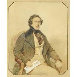 Unsigned Victorian watercolour portrait 'Young Gentleman Seated in a Chair' in a burr walnut frame, 26cm x 21cm